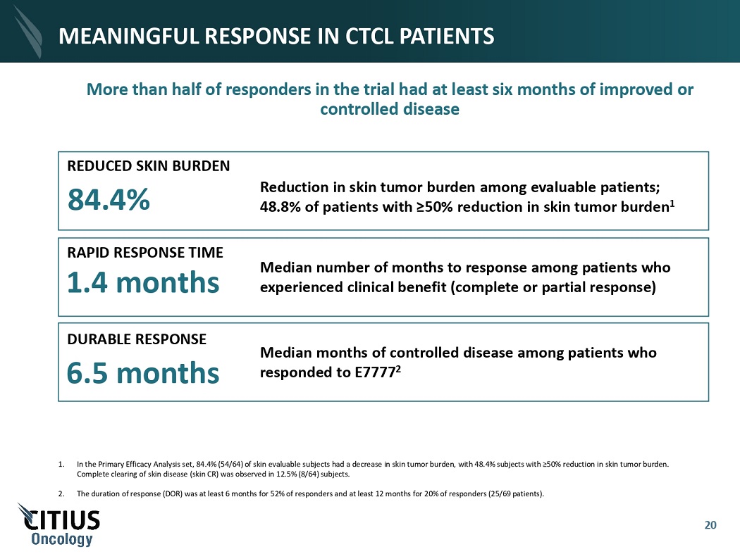MEANINGFUL RESPONSE IN CTCL PATIENTS 1. In the Primary Efficacy Analysis set, 84.4% (54/64) of skin evaluable subjects had a decrease in skin tumor burden, with 48.4% subjects with ≥50% reduction in skin tumor burden. Complete clearing of skin disease (skin CR) was observed in 12.5% (8/64) subjects. 2. The duration of response (DOR) was at least 6 months for 52% of responders and at least 12 months for 20% of responders (25/69 patients). RAPID RESPONSE TIME 1.4 months Median number of months to response among patients who experienced clinical benefit (complete or partial response) DURABLE RESPONSE 6.5 months Median months of controlled disease among patients who responded to E7777 2 Reduction in skin tumor burden among evaluable patients; 48.8% of patients with ≥50% reduction in skin tumor burden 1 REDUCED SKIN BURDEN 84.4% More than half of responders in the trial had at least six months of improved or controlled disease 20