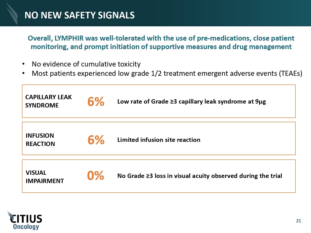 NO NEW SAFETY SIGNALS Low rate of Grade ≥3 capillary leak syndrome at 9µg 6% CAPILLARY LEAK SYNDROME Overall, LYMPHIR was well - tolerated with the use of pre - medications, close patient monitoring, and prompt initiation of supportive measures and drug management • No evidence of cumulative toxicity • Most patients experienced low grade 1/2 treatment emergent adverse events (TEAEs) 0% No Grade ≥3 loss in visual acuity observed during the trial VISUAL I M P A I R M ENT 6% Limited infusion site reaction INFUSION R E A C T I ON 21