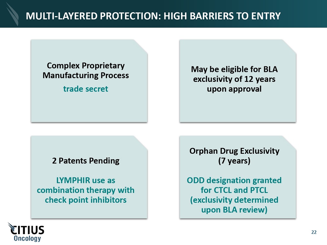 MULTI - LAYERED PROTECTION: HIGH BARRIERS TO ENTRY Complex Proprietary Manufacturing Process trade secret Orphan Drug Exclusivity (7 years) ODD designation granted for CTCL and PTCL (exclusivity determined upon BLA review) May be eligible for BLA exclusivity of 12 years upon approval 2 Patents Pending LYMPHIR use as combination therapy with check point inhibitors 22