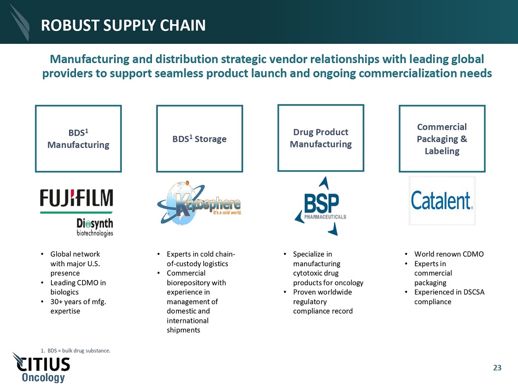 ROBUST SUPPLY CHAIN Manufacturing and distribution strategic vendor relationships with leading global providers to support seamless product launch and ongoing commercialization needs BDS 1 Manufacturing BDS 1 Storage Drug Product M anu f ac t u ring Commercial P ac k a g ing & Labeling • Experts in cold chain - of - custody logistics • Commercial bi o r e p o s i t o r y w i th experience in management of domestic and international shipments 23 • Gl o ba l n etw o rk with major U . S . presence • Leading CDMO in biologics • 30+ years of mfg. expertise • Specialize in manufacturing cytotoxic drug pr o du cts f o r o n c o l o g y • Proven worldwide regulatory c om plian c e r ec o rd • World renown CDMO • Experts in c om m e r c ial packaging • Experienced in DSCSA compliance 1. BDS = bulk drug substance.