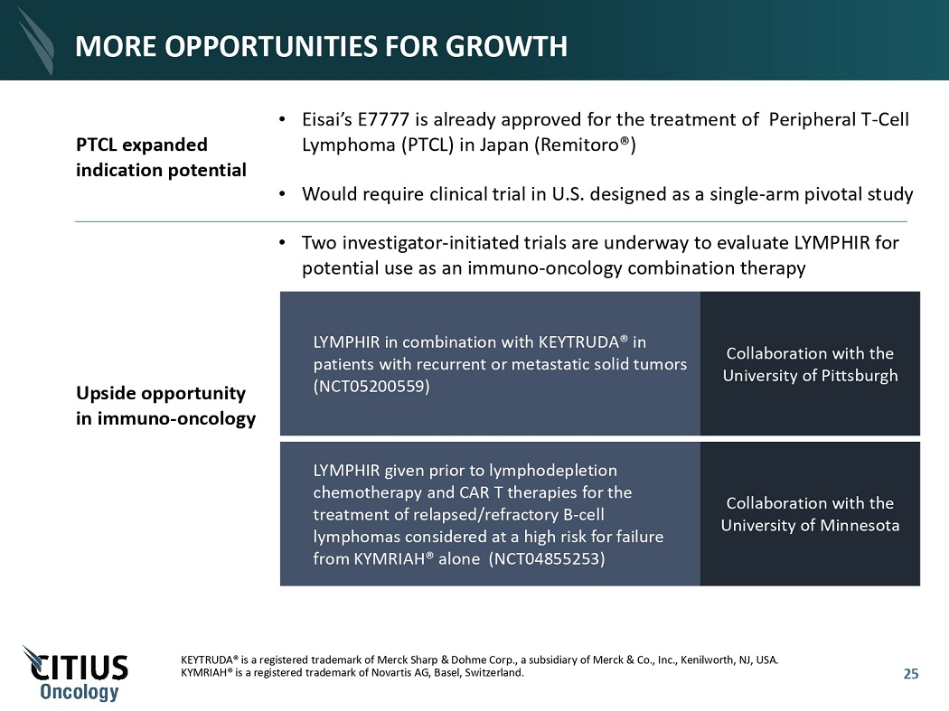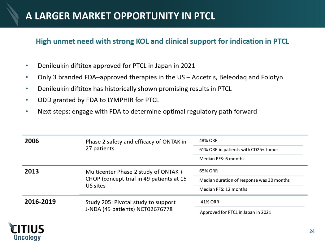 A LARGER MARKET OPPORTUNITY IN PTCL High unmet need with strong KOL and clinical support for indication in PTCL • Denileukin diftitox approved for PTCL in Japan in 2021 • Only 3 branded FDA – approved therapies in the US – Adcetris, Beleodaq and Folotyn • Denileukin diftitox has historically shown promising results in PTCL • ODD granted by FDA to LYMPHIR for PTCL • Next steps: engage with FDA to determine optimal regulatory path forward 2006 Phase 2 safety and efficacy of ONTAK in 27 patients 48% ORR 61% ORR in patients with CD25+ tumor Median PFS: 6 months 2013 Multicenter Phase 2 study of ONTAK + CHOP (concept trial in 49 patients at 15 US sites 65% ORR Median duration of response was 30 months Median PFS: 12 months 2016 - 2019 Study 205: Pivotal study to support J - NDA (45 patients) NCT02676778 Approved for PTCL in Japan in 2021 41% ORR 24