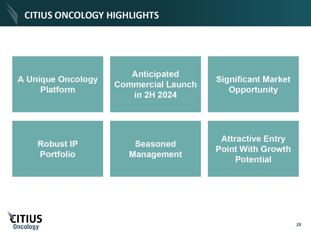27 ACCELERATED GROWTH AS A STANDALONE PUBLIC COMPANY Near - term revenue potential 2H 2024 Commercial Launch 1 High unmet need in CTCL implies rapid adoption Clear Market Opportunity 2 PTCL, combinations with CAR - T & PD - 1s and multiple potential future product in - licensing opportunities Drivers for Growth Beyond CTCL 3 Citius Oncology is primed for growth as a standalone public entity