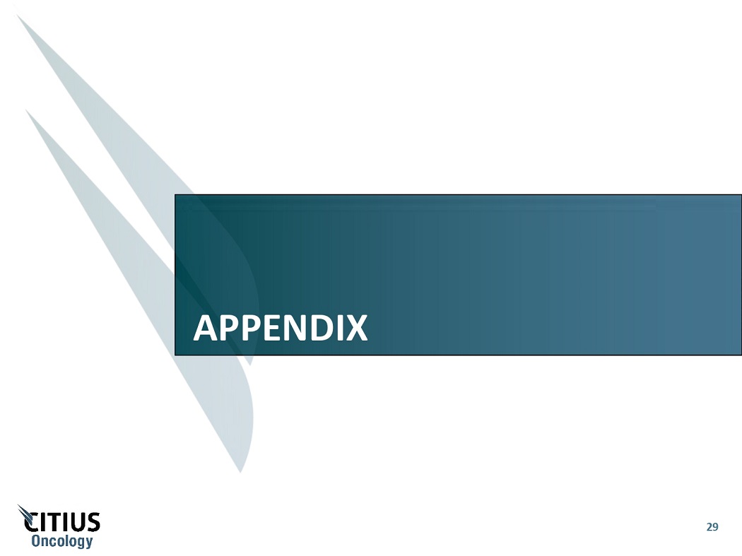 CITIUS ONCOLOGY HIGHLIGHTS 28 A Unique Oncology Platform Anticipated Commercial Launch in 2H 2024 Significant Market Opportunity Robust IP Portfolio Seasoned M a n a g e m e n t Attractive Entry Point With Growth Potential