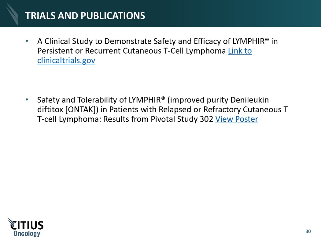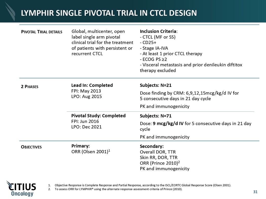 TRIALS AND PUBLICATIONS 30 • A Clinical Study to Demonstrate Safety and Efficacy of LYMPHIR® in Persistent or Recurrent Cutaneous T - Cell Lymphoma Link to clinicaltrials.gov • Safety and Tolerability of LYMPHIR® (improved purity Denileukin diftitox [ONTAK]) in Patients with Relapsed or Refractory Cutaneous T T - cell Lymphoma: Results from Pivotal Study 302 View Poster