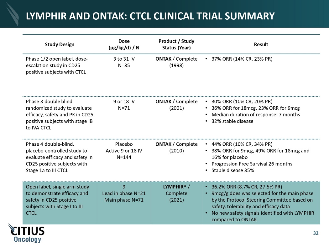 LYMPHIR SINGLE PIVOTAL TRIAL IN CTCL DESIGN P IVOTAL T RIAL DETAILS Global, multicenter, open label single arm pivotal clinical trial for the treatment of patients with persistent or recurrent CTCL Inclusion Criteria : - CTCL (MF or SS) - CD25+ - Stage IA - IVA - At least 1 prior CTCL therapy - ECOG PS ≥2 - Visceral metastasis and prior denileukin diftitox therapy excluded 2 P HASES Lead In: Completed FPI: May 2013 LPO: Aug 2015 Subjects: N=21 Dose finding by CRM: 6,9,12,15mcg/kg/d IV for 5 consecutive days in 21 day cycle PK and immunogenicity Pivotal Study: Completed FPI: Jun 2016 LPO: Dec 2021 Subjects: N=71 Dose: 9 mcg/kg/d IV for 5 consecutive days in 21 day cycle PK and immunogenicity O BJECTIVES 31 Primary: ORR (Olsen 2001) 1 Secondary: Overall DOR, TTR Skin RR, DOR, TTR ORR (Prince 2010) 2 PK and immunogenicity 1. Objective Response is Complete Response and Partial Response, according to the ISCL/EORTC Global Response Score (Olsen 2001). 2. To assess ORR for LYMPHIR® using the alternate response assessment criteria of Prince (2010).