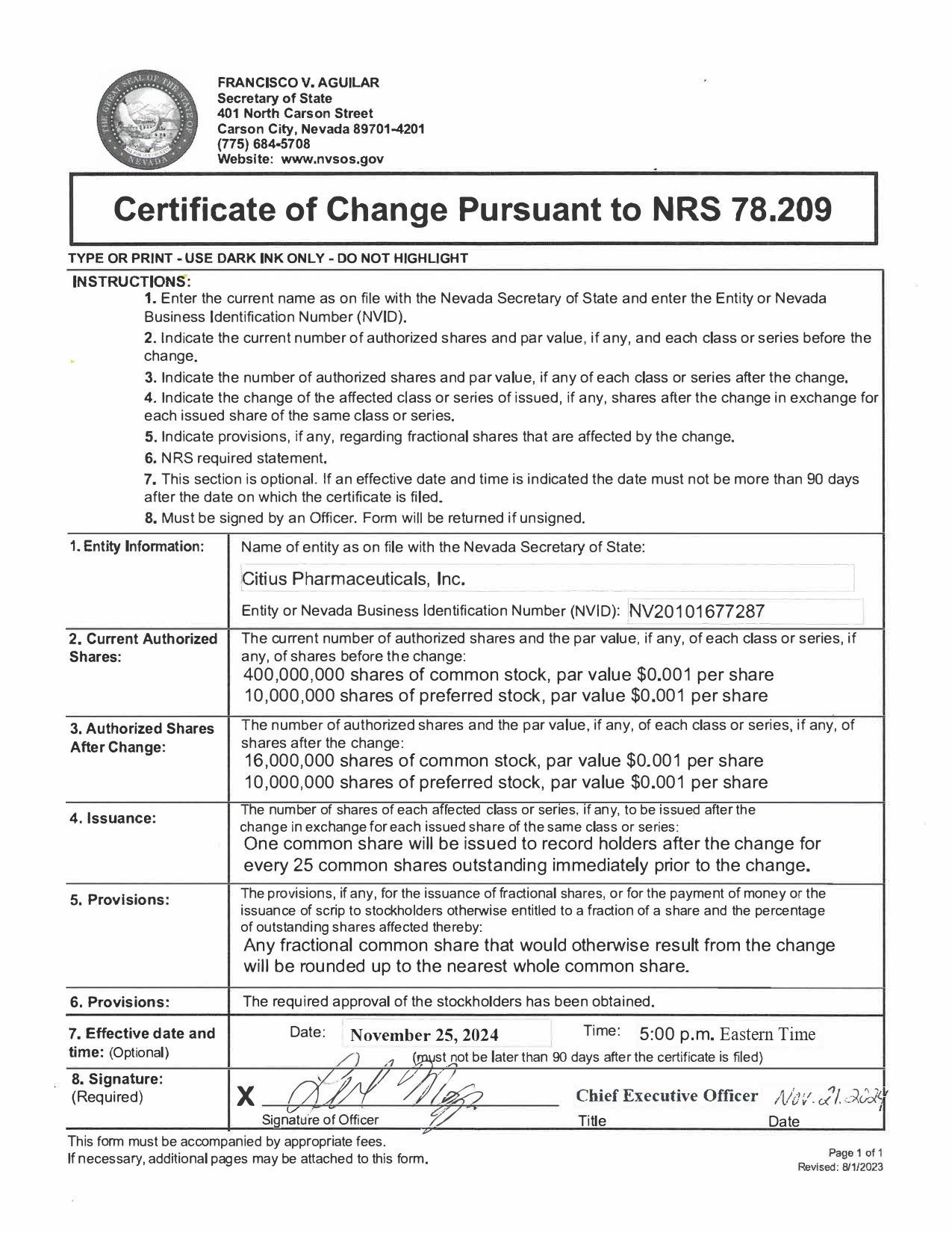 EX-3.1 2 ea022238001ex3-1_citius.htm CERTIFICATE OF CHANGE FILED WITH THE SECRETARY OF STATE OF THE STATE OF NEVADA ON NOVEMBER 22, 2024
