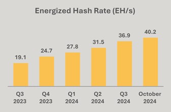 Grew our energized hash rate in October to 40.2 exahashes per second (“EH/s”), a 9% increase over September.