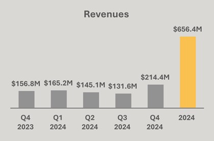 Revenues increased 37% to $214.4 million in Q4 2024 from $156.8 million in Q4 2023. For 2024, revenues grew 69% to $656.4 million from $387.5 million in 2023.