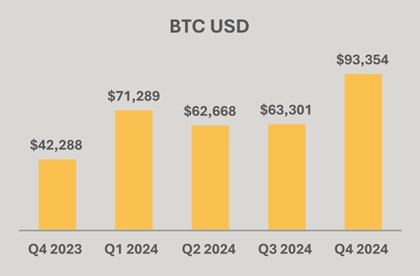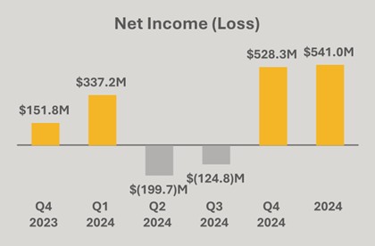 Net income increased 248% to $528.3 million, or $1.24 per diluted share, in Q4 2024 from net income of $151.8 million, or $0.66 per diluted share, in Q4 2023. Net income includes $742.7 million income on fair value of digital assets. Full year net income grew 107% to $541.0 million compared to net income of $261.2 million in 2023.