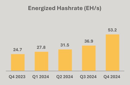 Energized hashrate (“EH/s”) increased 115% to 53.2 EH/s in Q4 2024 from 24.7 EH/s in Q4 2023.