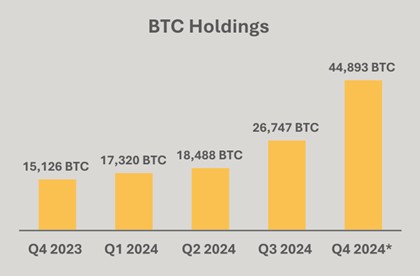 Bitcoin holdings (including loaned and collateralized bitcoin) increased 197% to 44,893 BTC (c. $4.6B) at year end, of which approximately 10,374 BTC was loaned to third parties or utilized as collateral for borrowings, generating additional return.