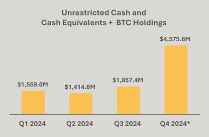 Combined unrestricted cash and cash equivalents and BTC (including loaned and collateralized bitcoin) increased to $4.6 billion as of December 31, 2024.