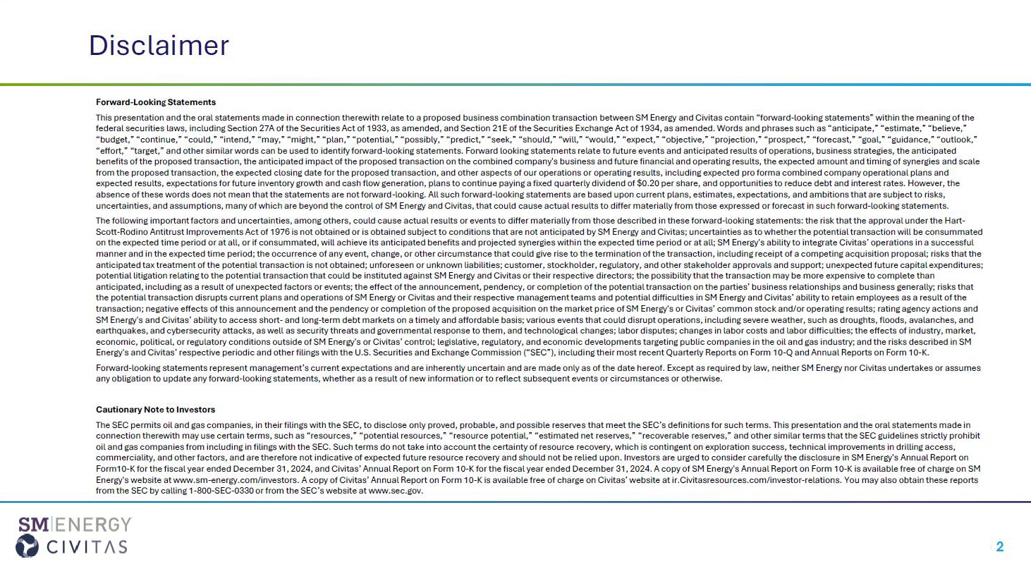 Transformational Combination Delivering Superior Stockholder Value November 3, 2025 NYSE: SM | SM-Energy.com NYSE: CIVI | CivitasResources.com