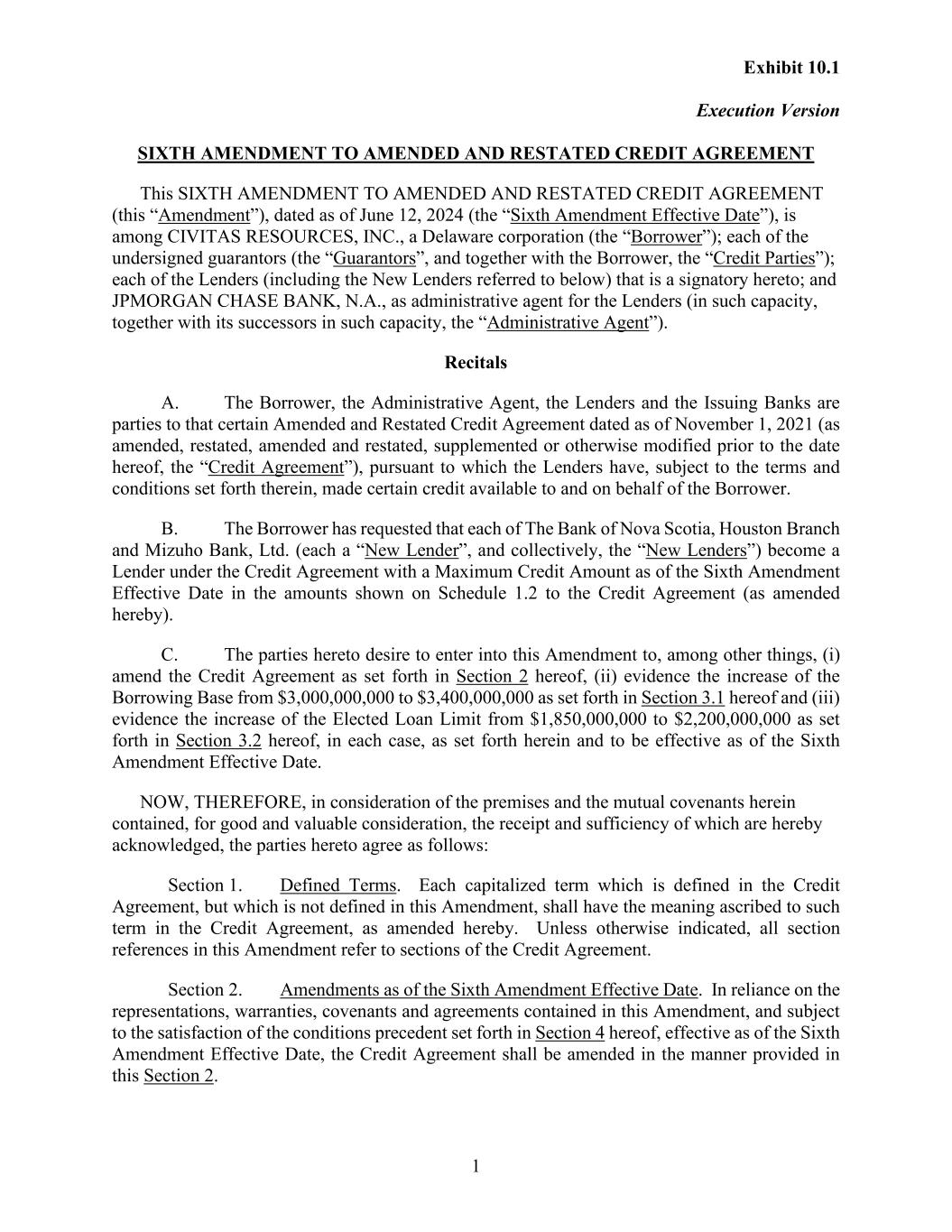 Exhibit 10.1 Execution Version 1 SIXTH AMENDMENT TO AMENDED AND RESTATED CREDIT AGREEMENT This SIXTH AMENDMENT TO AMENDED AND RESTATED CREDIT AGREEMENT (this “Amendment”), dated as of June 12, 2024 (the “Sixth Amendment Effective Date”), is among CIVITAS RESOURCES, INC., a Delaware corporation (the “Borrower”); each of the undersigned guarantors (the “Guarantors”, and together with the Borrower, the “Credit Parties”); each of the Lenders (including the New Lenders referred to below) that is a signatory hereto; and JPMORGAN CHASE BANK, N.A., as administrative agent for the Lenders (in such capacity, together with its successors in such capacity, the “Administrative Agent”). Recitals A. The Borrower, the Administrative Agent, the Lenders and the Issuing Banks are parties to that certain Amended and Restated Credit Agreement dated as of November 1, 2021 (as amended, restated, amended and restated, supplemented or otherwise modified prior to the date hereof, the “Credit Agreement”), pursuant to which the Lenders have, subject to the terms and conditions set forth therein, made certain credit available to and on behalf of the Borrower. B. The Borrower has requested that each of The Bank of Nova Scotia, Houston Branch and Mizuho Bank, Ltd. (each a “New Lender”, and collectively, the “New Lenders”) become a Lender under the Credit Agreement with a Maximum Credit Amount as of the Sixth Amendment Effective Date in the amounts shown on Schedule 1.2 to the Credit Agreement (as amended hereby). C. The parties hereto desire to enter into this Amendment to, among other things, (i) amend the Credit Agreement as set forth in Section 2 hereof, (ii) evidence the increase of the Borrowing Base from $3,000,000,000 to $3,400,000,000 as set forth in Section 3.1 hereof and (iii) evidence the increase of the Elected Loan Limit from $1,850,000,000 to $2,200,000,000 as set forth in Section 3.2 hereof, in each case, as set forth herein and to be effective as of the Sixth Amendment Effective Date. NOW, THEREFORE, in consideration of the premises and the mutual covenants herein contained, for good and valuable consideration, the receipt and sufficiency of which are hereby acknowledged, the parties hereto agree as follows: Section 1. Defined Terms. Each capitalized term which is defined in the Credit Agreement, but which is not defined in this Amendment, shall have the meaning ascribed to such term in the Credit Agreement, as amended hereby. Unless otherwise indicated, all section references in this Amendment refer to sections of the Credit Agreement. Section 2. Amendments as of the Sixth Amendment Effective Date. In reliance on the representations, warranties, covenants and agreements contained in this Amendment, and subject to the satisfaction of the conditions precedent set forth in Section 4 hereof, effective as of the Sixth Amendment Effective Date, the Credit Agreement shall be amended in the manner provided in this Section 2.