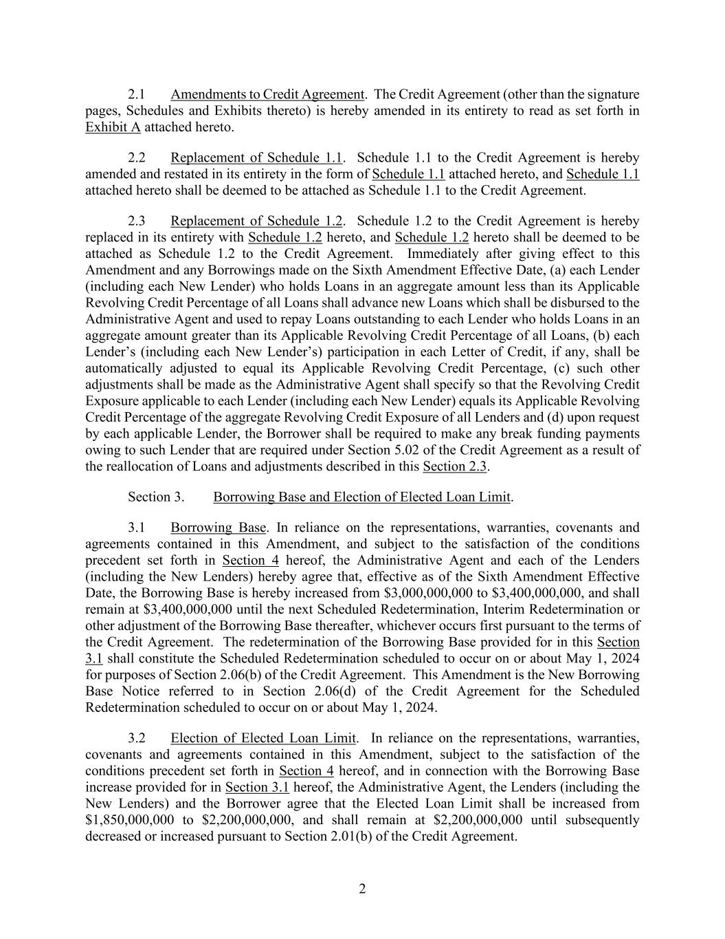 2 2.1 Amendments to Credit Agreement. The Credit Agreement (other than the signature pages, Schedules and Exhibits thereto) is hereby amended in its entirety to read as set forth in Exhibit A attached hereto. 2.2 Replacement of Schedule 1.1. Schedule 1.1 to the Credit Agreement is hereby amended and restated in its entirety in the form of Schedule 1.1 attached hereto, and Schedule 1.1 attached hereto shall be deemed to be attached as Schedule 1.1 to the Credit Agreement. 2.3 Replacement of Schedule 1.2. Schedule 1.2 to the Credit Agreement is hereby replaced in its entirety with Schedule 1.2 hereto, and Schedule 1.2 hereto shall be deemed to be attached as Schedule 1.2 to the Credit Agreement. Immediately after giving effect to this Amendment and any Borrowings made on the Sixth Amendment Effective Date, (a) each Lender (including each New Lender) who holds Loans in an aggregate amount less than its Applicable Revolving Credit Percentage of all Loans shall advance new Loans which shall be disbursed to the Administrative Agent and used to repay Loans outstanding to each Lender who holds Loans in an aggregate amount greater than its Applicable Revolving Credit Percentage of all Loans, (b) each Lender’s (including each New Lender’s) participation in each Letter of Credit, if any, shall be automatically adjusted to equal its Applicable Revolving Credit Percentage, (c) such other adjustments shall be made as the Administrative Agent shall specify so that the Revolving Credit Exposure applicable to each Lender (including each New Lender) equals its Applicable Revolving Credit Percentage of the aggregate Revolving Credit Exposure of all Lenders and (d) upon request by each applicable Lender, the Borrower shall be required to make any break funding payments owing to such Lender that are required under Section 5.02 of the Credit Agreement as a result of the reallocation of Loans and adjustments described in this Section 2.3. Section 3. Borrowing Base and Election of Elected Loan Limit. 3.1 Borrowing Base. In reliance on the representations, warranties, covenants and agreements contained in this Amendment, and subject to the satisfaction of the conditions precedent set forth in Section 4 hereof, the Administrative Agent and each of the Lenders (including the New Lenders) hereby agree that, effective as of the Sixth Amendment Effective Date, the Borrowing Base is hereby increased from $3,000,000,000 to $3,400,000,000, and shall remain at $3,400,000,000 until the next Scheduled Redetermination, Interim Redetermination or other adjustment of the Borrowing Base thereafter, whichever occurs first pursuant to the terms of the Credit Agreement. The redetermination of the Borrowing Base provided for in this Section 3.1 shall constitute the Scheduled Redetermination scheduled to occur on or about May 1, 2024 for purposes of Section 2.06(b) of the Credit Agreement. This Amendment is the New Borrowing Base Notice referred to in Section 2.06(d) of the Credit Agreement for the Scheduled Redetermination scheduled to occur on or about May 1, 2024. 3.2 Election of Elected Loan Limit. In reliance on the representations, warranties, covenants and agreements contained in this Amendment, subject to the satisfaction of the conditions precedent set forth in Section 4 hereof, and in connection with the Borrowing Base increase provided for in Section 3.1 hereof, the Administrative Agent, the Lenders (including the New Lenders) and the Borrower agree that the Elected Loan Limit shall be increased from $1,850,000,000 to $2,200,000,000, and shall remain at $2,200,000,000 until subsequently decreased or increased pursuant to Section 2.01(b) of the Credit Agreement.