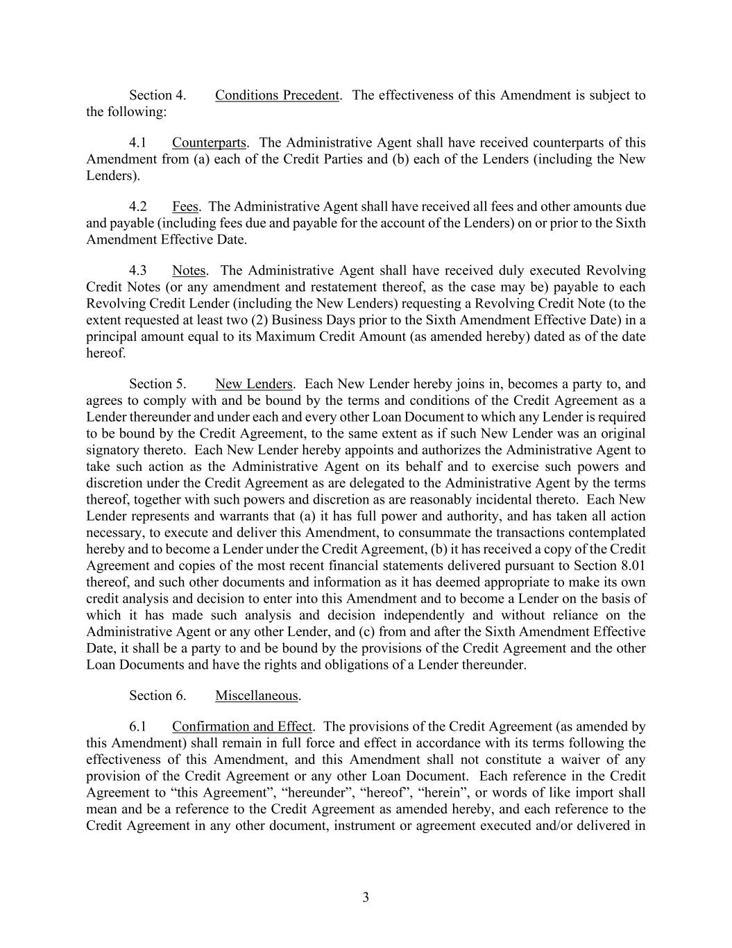3 Section 4. Conditions Precedent. The effectiveness of this Amendment is subject to the following: 4.1 Counterparts. The Administrative Agent shall have received counterparts of this Amendment from (a) each of the Credit Parties and (b) each of the Lenders (including the New Lenders). 4.2 Fees. The Administrative Agent shall have received all fees and other amounts due and payable (including fees due and payable for the account of the Lenders) on or prior to the Sixth Amendment Effective Date. 4.3 Notes. The Administrative Agent shall have received duly executed Revolving Credit Notes (or any amendment and restatement thereof, as the case may be) payable to each Revolving Credit Lender (including the New Lenders) requesting a Revolving Credit Note (to the extent requested at least two (2) Business Days prior to the Sixth Amendment Effective Date) in a principal amount equal to its Maximum Credit Amount (as amended hereby) dated as of the date hereof. Section 5. New Lenders. Each New Lender hereby joins in, becomes a party to, and agrees to comply with and be bound by the terms and conditions of the Credit Agreement as a Lender thereunder and under each and every other Loan Document to which any Lender is required to be bound by the Credit Agreement, to the same extent as if such New Lender was an original signatory thereto. Each New Lender hereby appoints and authorizes the Administrative Agent to take such action as the Administrative Agent on its behalf and to exercise such powers and discretion under the Credit Agreement as are delegated to the Administrative Agent by the terms thereof, together with such powers and discretion as are reasonably incidental thereto. Each New Lender represents and warrants that (a) it has full power and authority, and has taken all action necessary, to execute and deliver this Amendment, to consummate the transactions contemplated hereby and to become a Lender under the Credit Agreement, (b) it has received a copy of the Credit Agreement and copies of the most recent financial statements delivered pursuant to Section 8.01 thereof, and such other documents and information as it has deemed appropriate to make its own credit analysis and decision to enter into this Amendment and to become a Lender on the basis of which it has made such analysis and decision independently and without reliance on the Administrative Agent or any other Lender, and (c) from and after the Sixth Amendment Effective Date, it shall be a party to and be bound by the provisions of the Credit Agreement and the other Loan Documents and have the rights and obligations of a Lender thereunder. Section 6. Miscellaneous. 6.1 Confirmation and Effect. The provisions of the Credit Agreement (as amended by this Amendment) shall remain in full force and effect in accordance with its terms following the effectiveness of this Amendment, and this Amendment shall not constitute a waiver of any provision of the Credit Agreement or any other Loan Document. Each reference in the Credit Agreement to “this Agreement”, “hereunder”, “hereof”, “herein”, or words of like import shall mean and be a reference to the Credit Agreement as amended hereby, and each reference to the Credit Agreement in any other document, instrument or agreement executed and/or delivered in