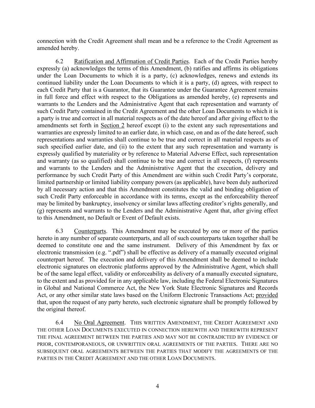 4 connection with the Credit Agreement shall mean and be a reference to the Credit Agreement as amended hereby. 6.2 Ratification and Affirmation of Credit Parties. Each of the Credit Parties hereby expressly (a) acknowledges the terms of this Amendment, (b) ratifies and affirms its obligations under the Loan Documents to which it is a party, (c) acknowledges, renews and extends its continued liability under the Loan Documents to which it is a party, (d) agrees, with respect to each Credit Party that is a Guarantor, that its Guarantee under the Guarantee Agreement remains in full force and effect with respect to the Obligations as amended hereby, (e) represents and warrants to the Lenders and the Administrative Agent that each representation and warranty of such Credit Party contained in the Credit Agreement and the other Loan Documents to which it is a party is true and correct in all material respects as of the date hereof and after giving effect to the amendments set forth in Section 2 hereof except (i) to the extent any such representations and warranties are expressly limited to an earlier date, in which case, on and as of the date hereof, such representations and warranties shall continue to be true and correct in all material respects as of such specified earlier date, and (ii) to the extent that any such representation and warranty is expressly qualified by materiality or by reference to Material Adverse Effect, such representation and warranty (as so qualified) shall continue to be true and correct in all respects, (f) represents and warrants to the Lenders and the Administrative Agent that the execution, delivery and performance by such Credit Party of this Amendment are within such Credit Party’s corporate, limited partnership or limited liability company powers (as applicable), have been duly authorized by all necessary action and that this Amendment constitutes the valid and binding obligation of such Credit Party enforceable in accordance with its terms, except as the enforceability thereof may be limited by bankruptcy, insolvency or similar laws affecting creditor’s rights generally, and (g) represents and warrants to the Lenders and the Administrative Agent that, after giving effect to this Amendment, no Default or Event of Default exists. 6.3 Counterparts. This Amendment may be executed by one or more of the parties hereto in any number of separate counterparts, and all of such counterparts taken together shall be deemed to constitute one and the same instrument. Delivery of this Amendment by fax or electronic transmission (e.g. “.pdf”) shall be effective as delivery of a manually executed original counterpart hereof. The execution and delivery of this Amendment shall be deemed to include electronic signatures on electronic platforms approved by the Administrative Agent, which shall be of the same legal effect, validity or enforceability as delivery of a manually executed signature, to the extent and as provided for in any applicable law, including the Federal Electronic Signatures in Global and National Commerce Act, the New York State Electronic Signatures and Records Act, or any other similar state laws based on the Uniform Electronic Transactions Act; provided that, upon the request of any party hereto, such electronic signature shall be promptly followed by the original thereof. 6.4 No Oral Agreement. THIS WRITTEN AMENDMENT, THE CREDIT AGREEMENT AND THE OTHER LOAN DOCUMENTS EXECUTED IN CONNECTION HEREWITH AND THEREWITH REPRESENT THE FINAL AGREEMENT BETWEEN THE PARTIES AND MAY NOT BE CONTRADICTED BY EVIDENCE OF PRIOR, CONTEMPORANEOUS, OR UNWRITTEN ORAL AGREEMENTS OF THE PARTIES. THERE ARE NO SUBSEQUENT ORAL AGREEMENTS BETWEEN THE PARTIES THAT MODIFY THE AGREEMENTS OF THE PARTIES IN THE CREDIT AGREEMENT AND THE OTHER LOAN DOCUMENTS.