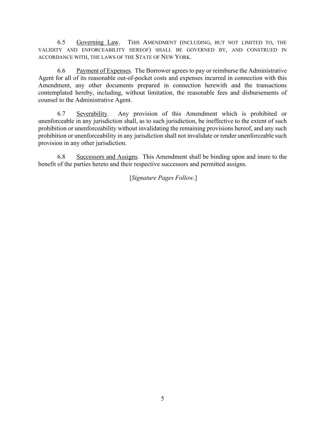 5 6.5 Governing Law. THIS AMENDMENT (INCLUDING, BUT NOT LIMITED TO, THE VALIDITY AND ENFORCEABILITY HEREOF) SHALL BE GOVERNED BY, AND CONSTRUED IN ACCORDANCE WITH, THE LAWS OF THE STATE OF NEW YORK. 6.6 Payment of Expenses. The Borrower agrees to pay or reimburse the Administrative Agent for all of its reasonable out-of-pocket costs and expenses incurred in connection with this Amendment, any other documents prepared in connection herewith and the transactions contemplated hereby, including, without limitation, the reasonable fees and disbursements of counsel to the Administrative Agent. 6.7 Severability. Any provision of this Amendment which is prohibited or unenforceable in any jurisdiction shall, as to such jurisdiction, be ineffective to the extent of such prohibition or unenforceability without invalidating the remaining provisions hereof, and any such prohibition or unenforceability in any jurisdiction shall not invalidate or render unenforceable such provision in any other jurisdiction. 6.8 Successors and Assigns. This Amendment shall be binding upon and inure to the benefit of the parties hereto and their respective successors and permitted assigns. [Signature Pages Follow.]
