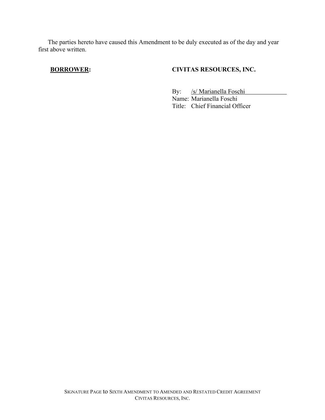 SIGNATURE PAGE to SIXTH AMENDMENT TO AMENDED AND RESTATED CREDIT AGREEMENT CIVITAS RESOURCES, INC. The parties hereto have caused this Amendment to be duly executed as of the day and year first above written. BORROWER: CIVITAS RESOURCES, INC. By: /s/ Marianella Foschi Name: Marianella Foschi Title: Chief Financial Officer