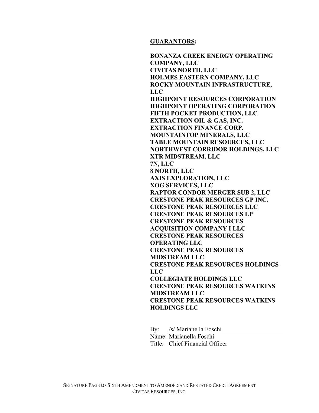 SIGNATURE PAGE to SIXTH AMENDMENT TO AMENDED AND RESTATED CREDIT AGREEMENT CIVITAS RESOURCES, INC. GUARANTORS: BONANZA CREEK ENERGY OPERATING COMPANY, LLC CIVITAS NORTH, LLC HOLMES EASTERN COMPANY, LLC ROCKY MOUNTAIN INFRASTRUCTURE, LLC HIGHPOINT RESOURCES CORPORATION HIGHPOINT OPERATING CORPORATION FIFTH POCKET PRODUCTION, LLC EXTRACTION OIL & GAS, INC. EXTRACTION FINANCE CORP. MOUNTAINTOP MINERALS, LLC TABLE MOUNTAIN RESOURCES, LLC NORTHWEST CORRIDOR HOLDINGS, LLC XTR MIDSTREAM, LLC 7N, LLC 8 NORTH, LLC AXIS EXPLORATION, LLC XOG SERVICES, LLC RAPTOR CONDOR MERGER SUB 2, LLC CRESTONE PEAK RESOURCES GP INC. CRESTONE PEAK RESOURCES LLC CRESTONE PEAK RESOURCES LP CRESTONE PEAK RESOURCES ACQUISITION COMPANY I LLC CRESTONE PEAK RESOURCES OPERATING LLC CRESTONE PEAK RESOURCES MIDSTREAM LLC CRESTONE PEAK RESOURCES HOLDINGS LLC COLLEGIATE HOLDINGS LLC CRESTONE PEAK RESOURCES WATKINS MIDSTREAM LLC CRESTONE PEAK RESOURCES WATKINS HOLDINGS LLC By: /s/ Marianella Foschi Name: Marianella Foschi Title: Chief Financial Officer