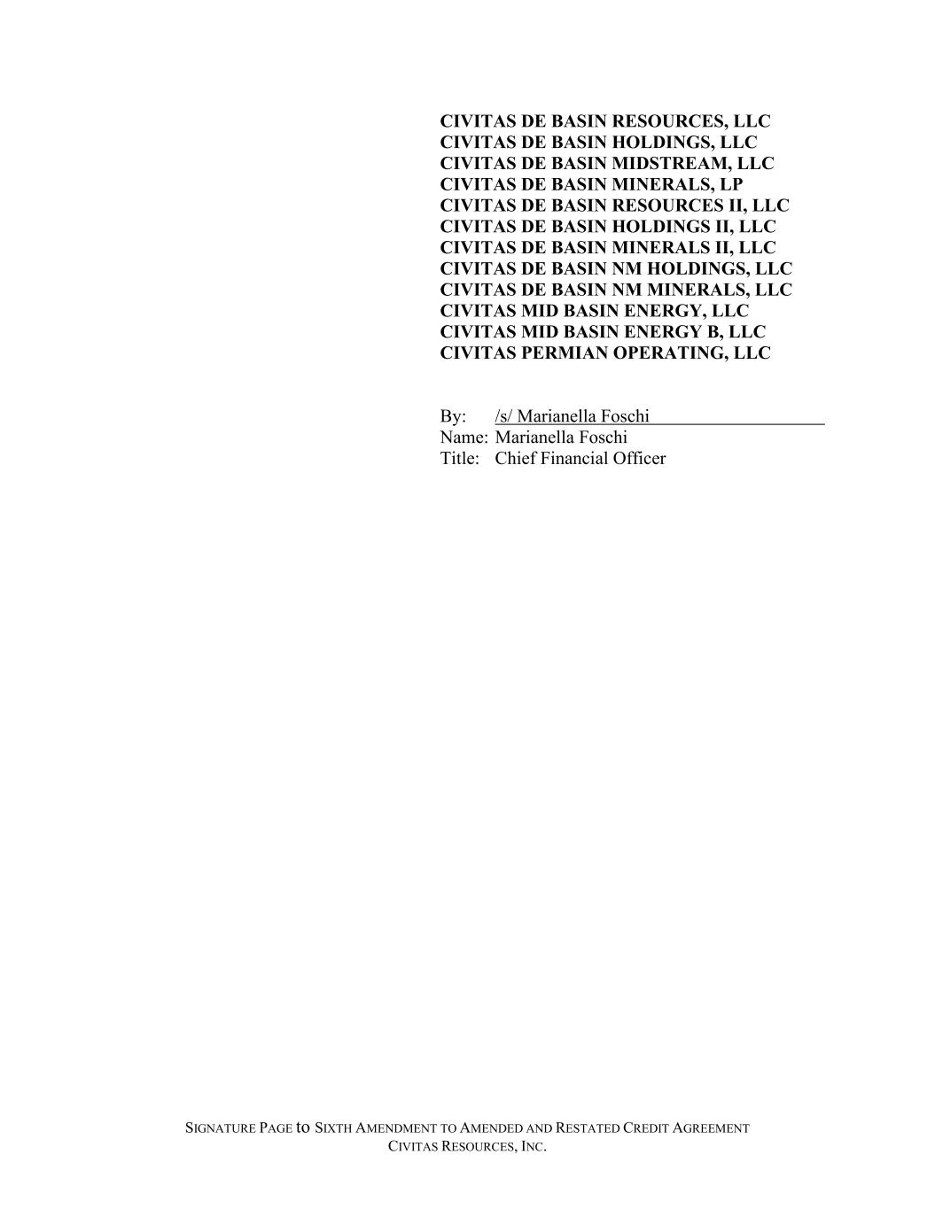 SIGNATURE PAGE to SIXTH AMENDMENT TO AMENDED AND RESTATED CREDIT AGREEMENT CIVITAS RESOURCES, INC. CIVITAS DE BASIN RESOURCES, LLC CIVITAS DE BASIN HOLDINGS, LLC CIVITAS DE BASIN MIDSTREAM, LLC CIVITAS DE BASIN MINERALS, LP CIVITAS DE BASIN RESOURCES II, LLC CIVITAS DE BASIN HOLDINGS II, LLC CIVITAS DE BASIN MINERALS II, LLC CIVITAS DE BASIN NM HOLDINGS, LLC CIVITAS DE BASIN NM MINERALS, LLC CIVITAS MID BASIN ENERGY, LLC CIVITAS MID BASIN ENERGY B, LLC CIVITAS PERMIAN OPERATING, LLC By: /s/ Marianella Foschi Name: Marianella Foschi Title: Chief Financial Officer