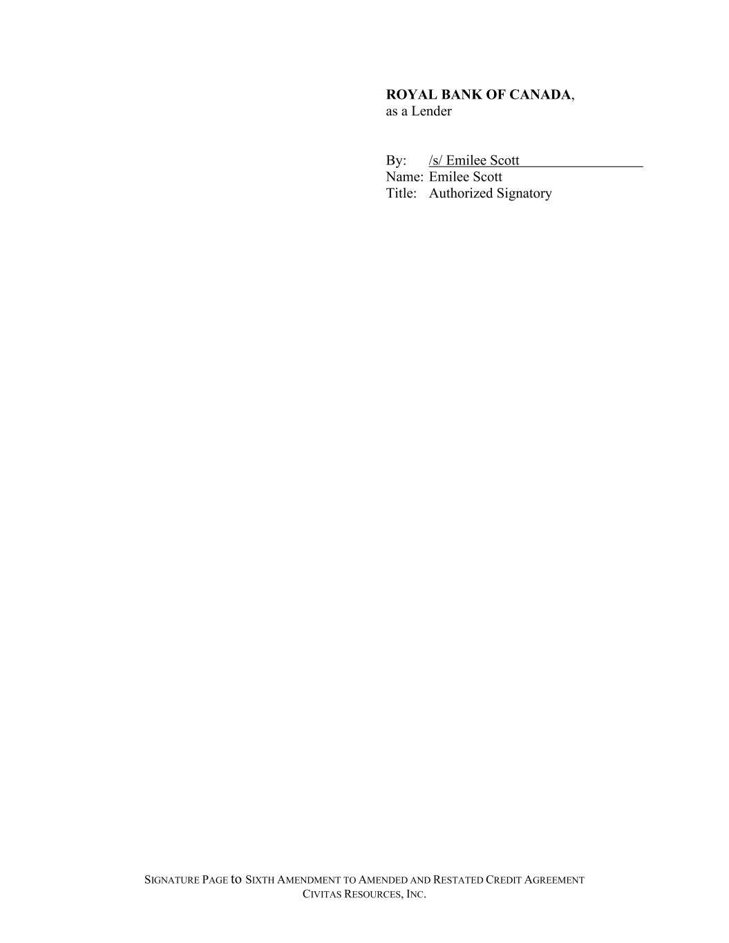 SIGNATURE PAGE to SIXTH AMENDMENT TO AMENDED AND RESTATED CREDIT AGREEMENT CIVITAS RESOURCES, INC. ROYAL BANK OF CANADA, as a Lender By: /s/ Emilee Scott Name: Emilee Scott Title: Authorized Signatory