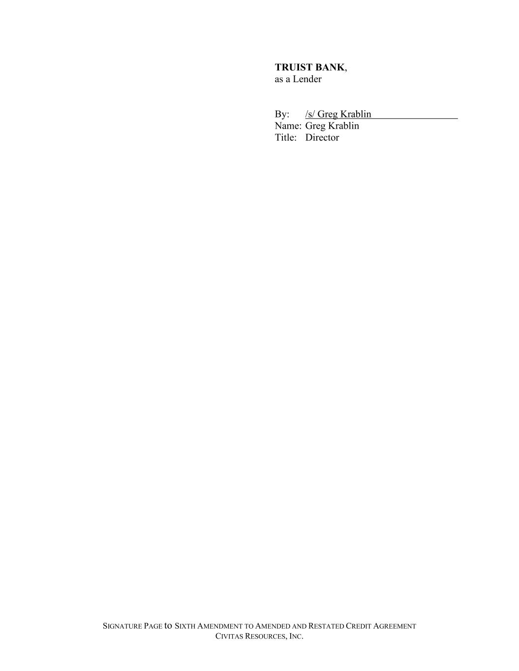 SIGNATURE PAGE to SIXTH AMENDMENT TO AMENDED AND RESTATED CREDIT AGREEMENT CIVITAS RESOURCES, INC. TRUIST BANK, as a Lender By: /s/ Greg Krablin Name: Greg Krablin Title: Director