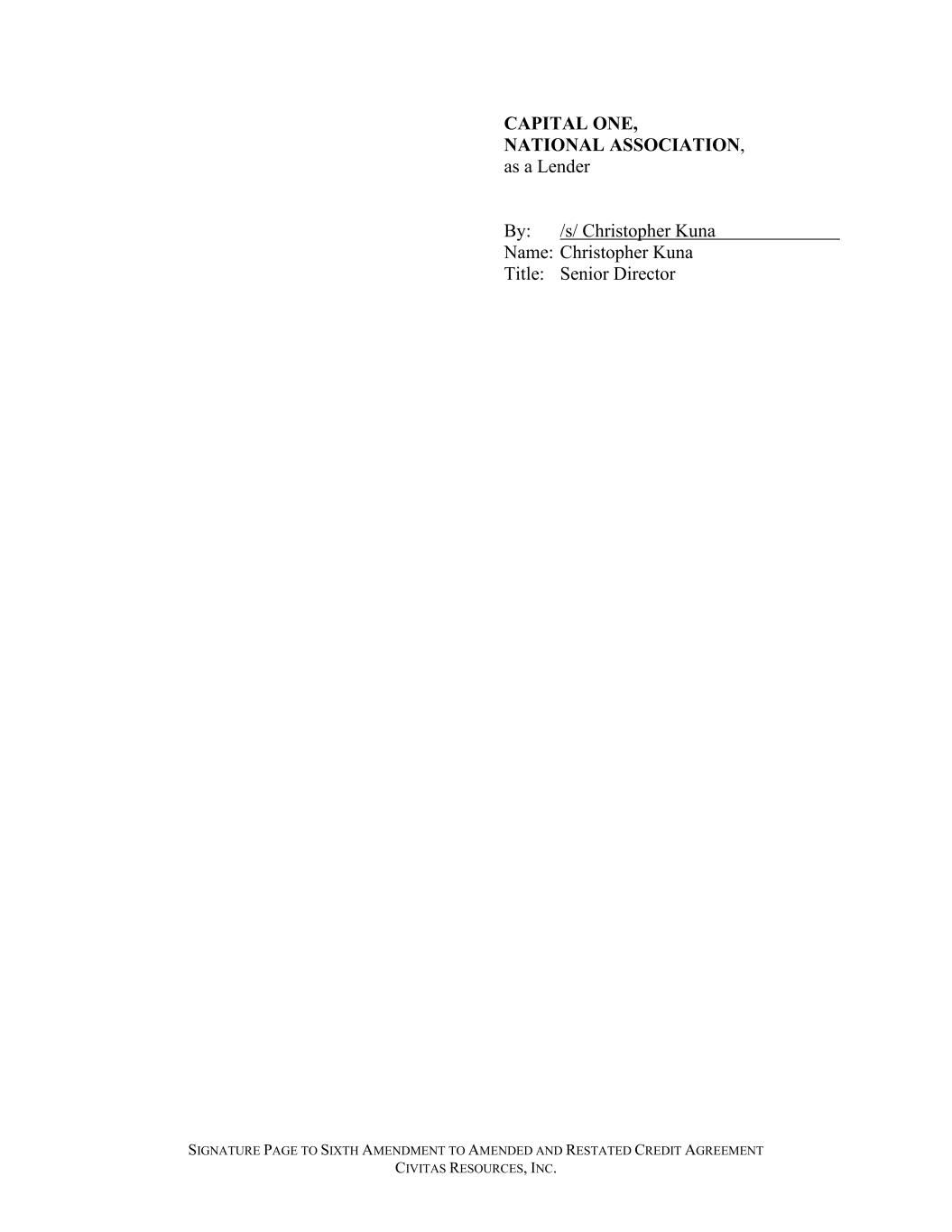 SIGNATURE PAGE TO SIXTH AMENDMENT TO AMENDED AND RESTATED CREDIT AGREEMENT CIVITAS RESOURCES, INC. CAPITAL ONE, NATIONAL ASSOCIATION, as a Lender By: /s/ Christopher Kuna Name: Christopher Kuna Title: Senior Director