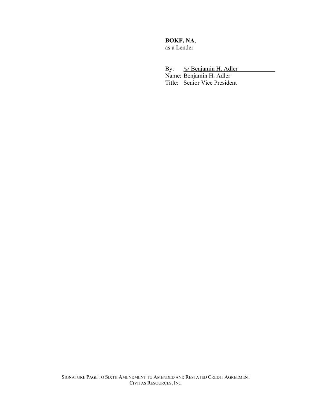SIGNATURE PAGE TO SIXTH AMENDMENT TO AMENDED AND RESTATED CREDIT AGREEMENT CIVITAS RESOURCES, INC. BOKF, NA, as a Lender By: /s/ Benjamin H. Adler Name: Benjamin H. Adler Title: Senior Vice President
