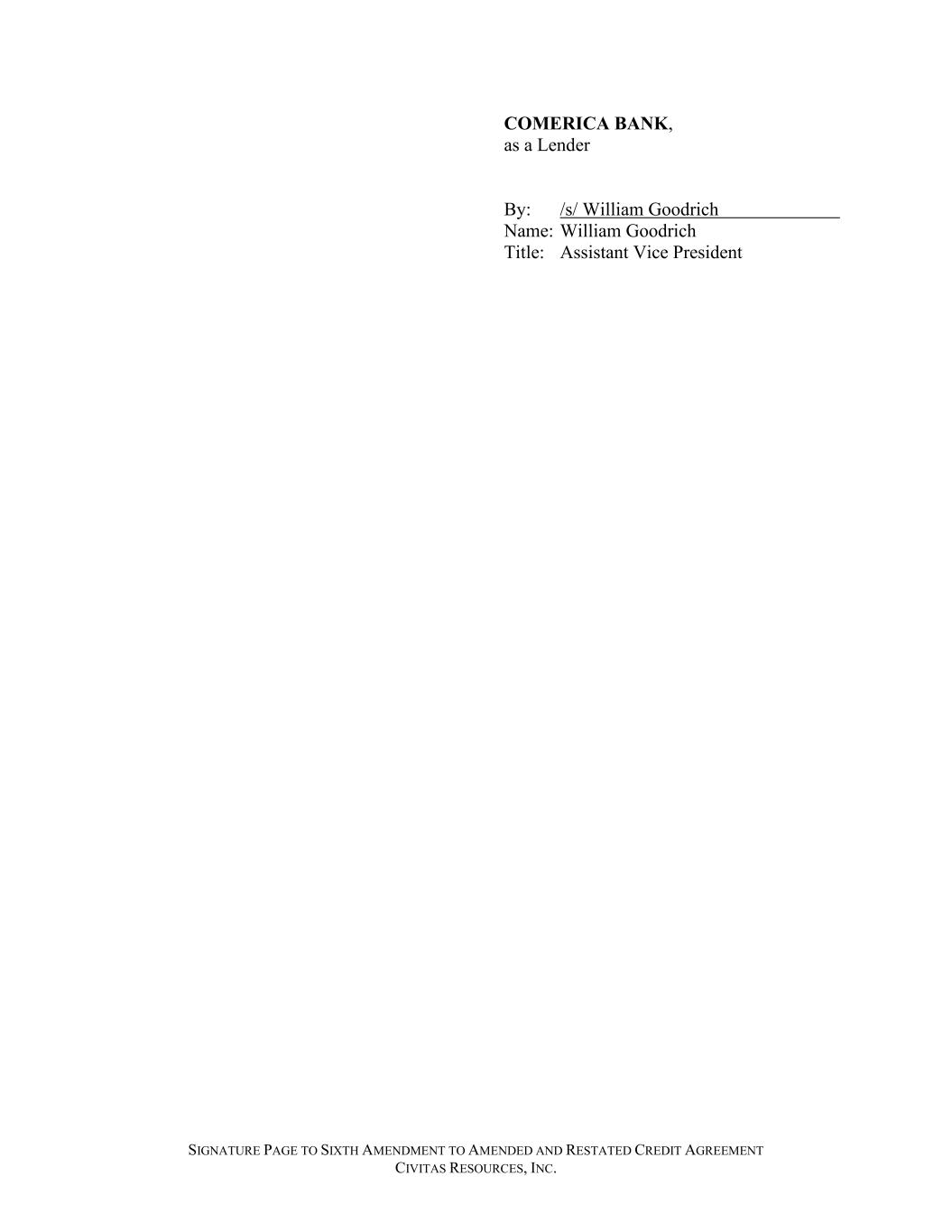 SIGNATURE PAGE TO SIXTH AMENDMENT TO AMENDED AND RESTATED CREDIT AGREEMENT CIVITAS RESOURCES, INC. COMERICA BANK, as a Lender By: /s/ William Goodrich Name: William Goodrich Title: Assistant Vice President