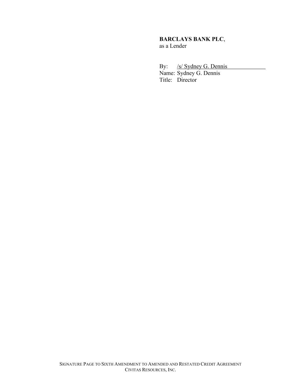 SIGNATURE PAGE TO SIXTH AMENDMENT TO AMENDED AND RESTATED CREDIT AGREEMENT CIVITAS RESOURCES, INC. BARCLAYS BANK PLC, as a Lender By: /s/ Sydney G. Dennis Name: Sydney G. Dennis Title: Director