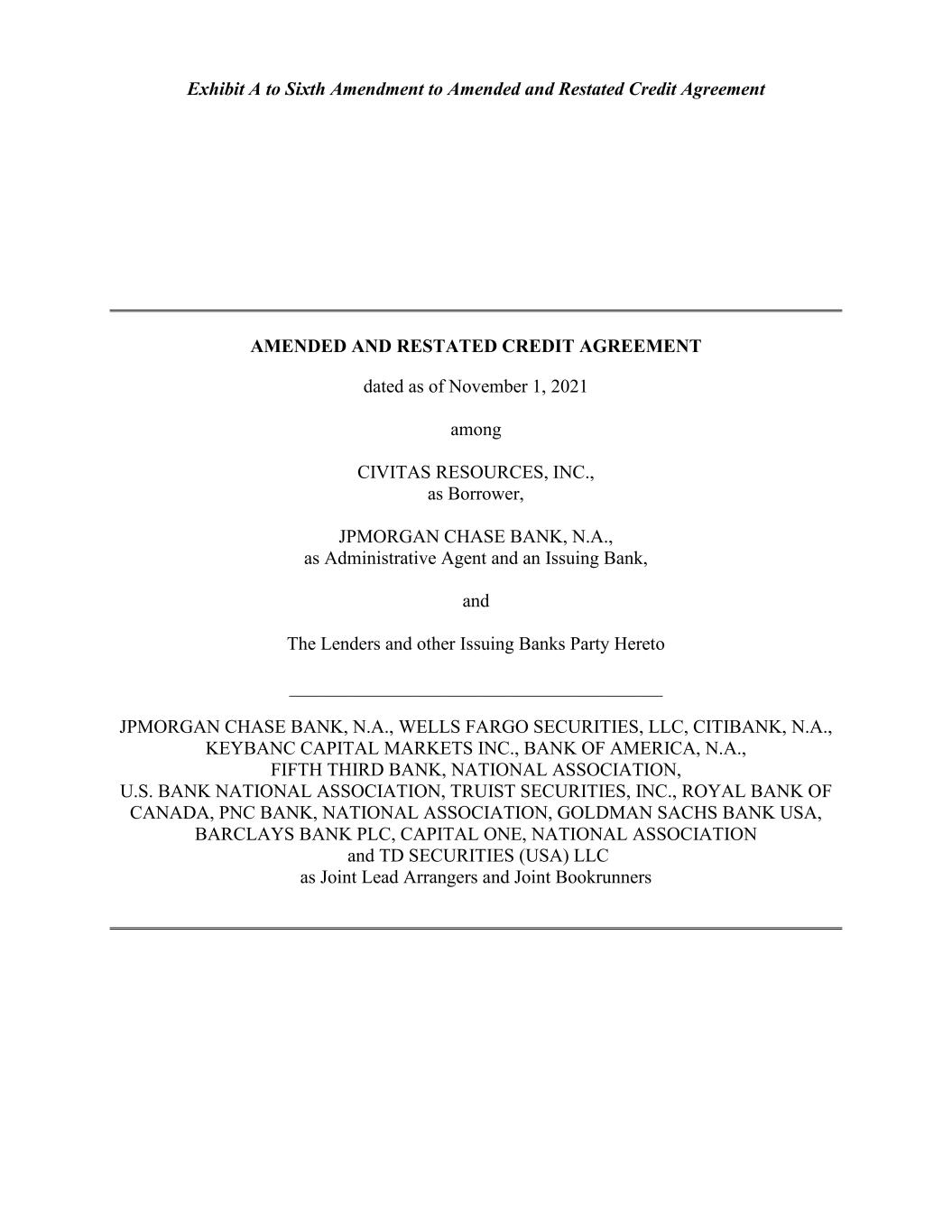 Exhibit A to Sixth Amendment to Amended and Restated Credit Agreement AMENDED AND RESTATED CREDIT AGREEMENT dated as of November 1, 2021 among CIVITAS RESOURCES, INC., as Borrower, JPMORGAN CHASE BANK, N.A., as Administrative Agent and an Issuing Bank, and The Lenders and other Issuing Banks Party Hereto ________________________________________ JPMORGAN CHASE BANK, N.A., WELLS FARGO SECURITIES, LLC, CITIBANK, N.A., KEYBANC CAPITAL MARKETS INC., BANK OF AMERICA, N.A., FIFTH THIRD BANK, NATIONAL ASSOCIATION, U.S. BANK NATIONAL ASSOCIATION, TRUIST SECURITIES, INC., ROYAL BANK OF CANADA, PNC BANK, NATIONAL ASSOCIATION, GOLDMAN SACHS BANK USA, BARCLAYS BANK PLC, CAPITAL ONE, NATIONAL ASSOCIATION and TD SECURITIES (USA) LLC as Joint Lead Arrangers and Joint Bookrunners