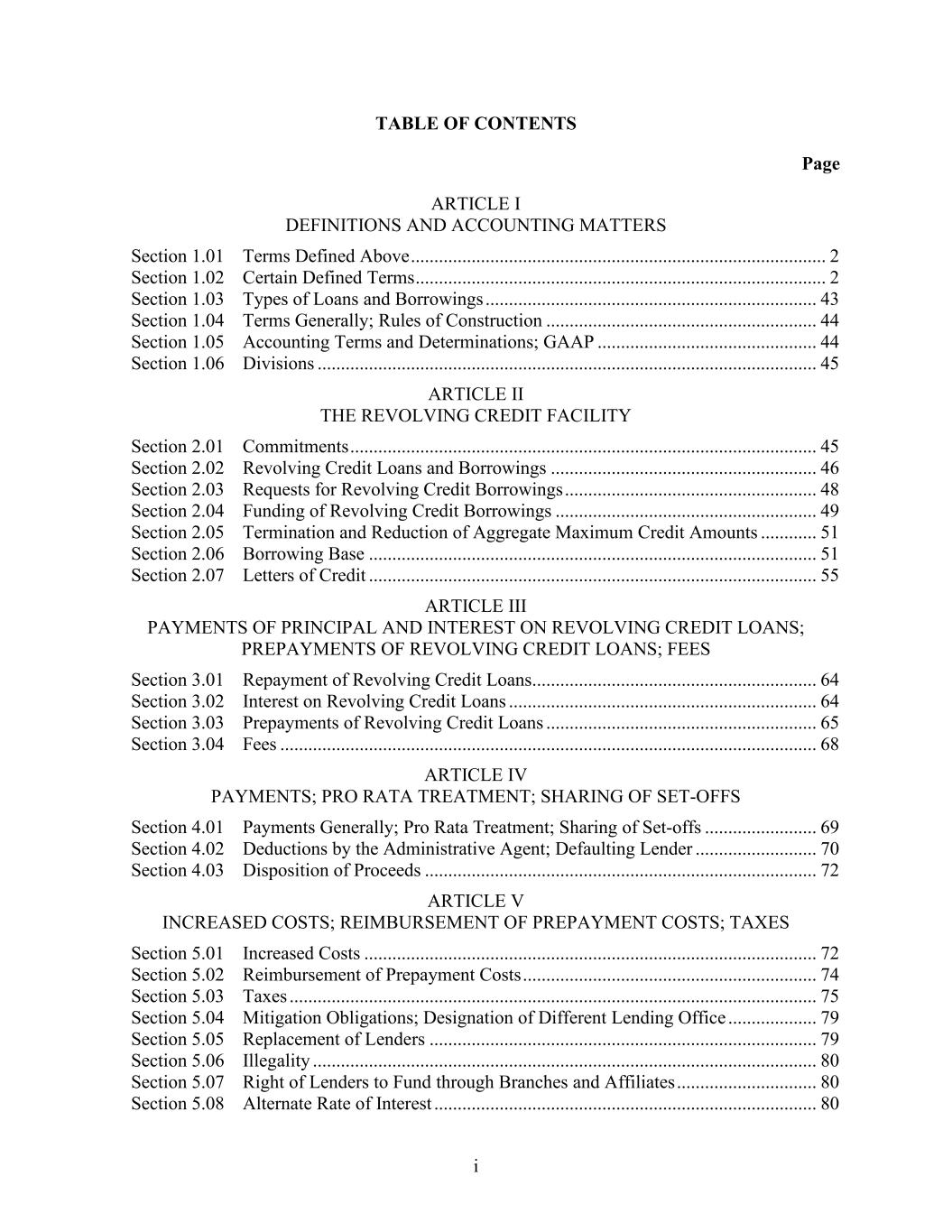 i TABLE OF CONTENTS Page ARTICLE I DEFINITIONS AND ACCOUNTING MATTERS Section 1.01 Terms Defined Above ......................................................................................... 2 Section 1.02 Certain Defined Terms ........................................................................................ 2 Section 1.03 Types of Loans and Borrowings ....................................................................... 43 Section 1.04 Terms Generally; Rules of Construction .......................................................... 44 Section 1.05 Accounting Terms and Determinations; GAAP ............................................... 44 Section 1.06 Divisions ........................................................................................................... 45 ARTICLE II THE REVOLVING CREDIT FACILITY Section 2.01 Commitments .................................................................................................... 45 Section 2.02 Revolving Credit Loans and Borrowings ......................................................... 46 Section 2.03 Requests for Revolving Credit Borrowings ...................................................... 48 Section 2.04 Funding of Revolving Credit Borrowings ........................................................ 49 Section 2.05 Termination and Reduction of Aggregate Maximum Credit Amounts ............ 51 Section 2.06 Borrowing Base ................................................................................................ 51 Section 2.07 Letters of Credit ................................................................................................ 55 ARTICLE III PAYMENTS OF PRINCIPAL AND INTEREST ON REVOLVING CREDIT LOANS; PREPAYMENTS OF REVOLVING CREDIT LOANS; FEES Section 3.01 Repayment of Revolving Credit Loans ............................................................. 64 Section 3.02 Interest on Revolving Credit Loans .................................................................. 64 Section 3.03 Prepayments of Revolving Credit Loans .......................................................... 65 Section 3.04 Fees ................................................................................................................... 68 ARTICLE IV PAYMENTS; PRO RATA TREATMENT; SHARING OF SET-OFFS Section 4.01 Payments Generally; Pro Rata Treatment; Sharing of Set-offs ........................ 69 Section 4.02 Deductions by the Administrative Agent; Defaulting Lender .......................... 70 Section 4.03 Disposition of Proceeds .................................................................................... 72 ARTICLE V INCREASED COSTS; REIMBURSEMENT OF PREPAYMENT COSTS; TAXES Section 5.01 Increased Costs ................................................................................................. 72 Section 5.02 Reimbursement of Prepayment Costs ............................................................... 74 Section 5.03 Taxes ................................................................................................................. 75 Section 5.04 Mitigation Obligations; Designation of Different Lending Office ................... 79 Section 5.05 Replacement of Lenders ................................................................................... 79 Section 5.06 Illegality ............................................................................................................ 80 Section 5.07 Right of Lenders to Fund through Branches and Affiliates .............................. 80 Section 5.08 Alternate Rate of Interest .................................................................................. 80