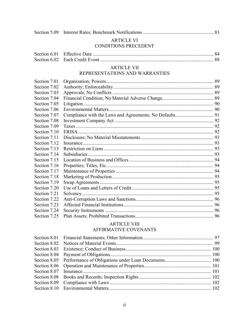 ii Section 5.09 Interest Rates; Benchmark Notifications .......................................................... 83 ARTICLE VI CONDITIONS PRECEDENT Section 6.01 Effective Date ................................................................................................... 84 Section 6.02 Each Credit Event ............................................................................................. 88 ARTICLE VII REPRESENTATIONS AND WARRANTIES Section 7.01 Organization; Powers ........................................................................................ 89 Section 7.02 Authority; Enforceability .................................................................................. 89 Section 7.03 Approvals; No Conflicts ................................................................................... 89 Section 7.04 Financial Condition; No Material Adverse Change .......................................... 89 Section 7.05 Litigation ........................................................................................................... 90 Section 7.06 Environmental Matters...................................................................................... 90 Section 7.07 Compliance with the Laws and Agreements; No Defaults ............................... 91 Section 7.08 Investment Company Act ................................................................................. 92 Section 7.09 Taxes ................................................................................................................. 92 Section 7.10 ERISA ............................................................................................................... 92 Section 7.11 Disclosure; No Material Misstatements ............................................................ 93 Section 7.12 Insurance ........................................................................................................... 93 Section 7.13 Restriction on Liens .......................................................................................... 93 Section 7.14 Subsidiaries ....................................................................................................... 93 Section 7.15 Location of Business and Offices ..................................................................... 94 Section 7.16 Properties; Titles, Etc. ....................................................................................... 94 Section 7.17 Maintenance of Properties ................................................................................ 94 Section 7.18 Marketing of Production ................................................................................... 95 Section 7.19 Swap Agreements ............................................................................................. 95 Section 7.20 Use of Loans and Letters of Credit ................................................................... 95 Section 7.21 Solvency ............................................................................................................ 95 Section 7.22 Anti-Corruption Laws and Sanctions................................................................ 96 Section 7.23 Affected Financial Institutions .......................................................................... 96 Section 7.24 Security Instruments ......................................................................................... 96 Section 7.25 Plan Assets; Prohibited Transactions ................................................................ 96 ARTICLE VIII AFFIRMATIVE COVENANTS Section 8.01 Financial Statements; Other Information .......................................................... 97 Section 8.02 Notices of Material Events................................................................................ 99 Section 8.03 Existence; Conduct of Business ...................................................................... 100 Section 8.04 Payment of Obligations................................................................................... 100 Section 8.05 Performance of Obligations under Loan Documents...................................... 100 Section 8.06 Operation and Maintenance of Properties....................................................... 101 Section 8.07 Insurance ......................................................................................................... 101 Section 8.08 Books and Records; Inspection Rights ........................................................... 102 Section 8.09 Compliance with Laws ................................................................................... 102 Section 8.10 Environmental Matters.................................................................................... 102