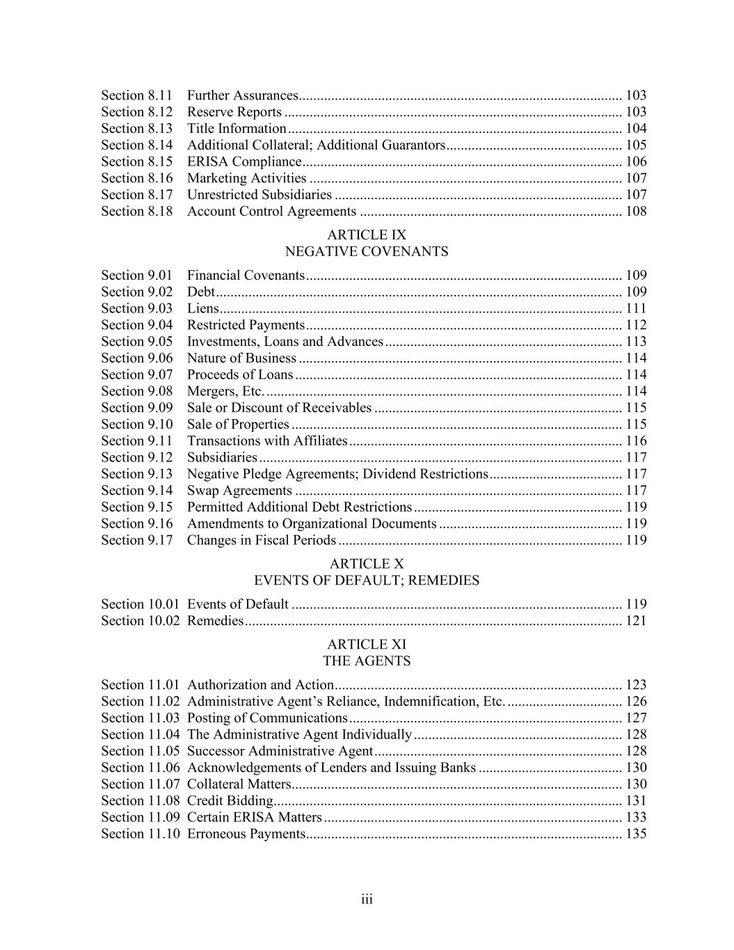 iii Section 8.11 Further Assurances.......................................................................................... 103 Section 8.12 Reserve Reports .............................................................................................. 103 Section 8.13 Title Information ............................................................................................. 104 Section 8.14 Additional Collateral; Additional Guarantors ................................................. 105 Section 8.15 ERISA Compliance ......................................................................................... 106 Section 8.16 Marketing Activities ....................................................................................... 107 Section 8.17 Unrestricted Subsidiaries ................................................................................ 107 Section 8.18 Account Control Agreements ......................................................................... 108 ARTICLE IX NEGATIVE COVENANTS Section 9.01 Financial Covenants ........................................................................................ 109 Section 9.02 Debt ................................................................................................................. 109 Section 9.03 Liens ................................................................................................................ 111 Section 9.04 Restricted Payments ........................................................................................ 112 Section 9.05 Investments, Loans and Advances .................................................................. 113 Section 9.06 Nature of Business .......................................................................................... 114 Section 9.07 Proceeds of Loans ........................................................................................... 114 Section 9.08 Mergers, Etc. ................................................................................................... 114 Section 9.09 Sale or Discount of Receivables ..................................................................... 115 Section 9.10 Sale of Properties ............................................................................................ 115 Section 9.11 Transactions with Affiliates ............................................................................ 116 Section 9.12 Subsidiaries ..................................................................................................... 117 Section 9.13 Negative Pledge Agreements; Dividend Restrictions ..................................... 117 Section 9.14 Swap Agreements ........................................................................................... 117 Section 9.15 Permitted Additional Debt Restrictions .......................................................... 119 Section 9.16 Amendments to Organizational Documents ................................................... 119 Section 9.17 Changes in Fiscal Periods ............................................................................... 119 ARTICLE X EVENTS OF DEFAULT; REMEDIES Section 10.01 Events of Default ............................................................................................ 119 Section 10.02 Remedies ......................................................................................................... 121 ARTICLE XI THE AGENTS Section 11.01 Authorization and Action ................................................................................ 123 Section 11.02 Administrative Agent’s Reliance, Indemnification, Etc. ................................ 126 Section 11.03 Posting of Communications ............................................................................ 127 Section 11.04 The Administrative Agent Individually .......................................................... 128 Section 11.05 Successor Administrative Agent ..................................................................... 128 Section 11.06 Acknowledgements of Lenders and Issuing Banks ........................................ 130 Section 11.07 Collateral Matters............................................................................................ 130 Section 11.08 Credit Bidding ................................................................................................. 131 Section 11.09 Certain ERISA Matters ................................................................................... 133 Section 11.10 Erroneous Payments........................................................................................ 135