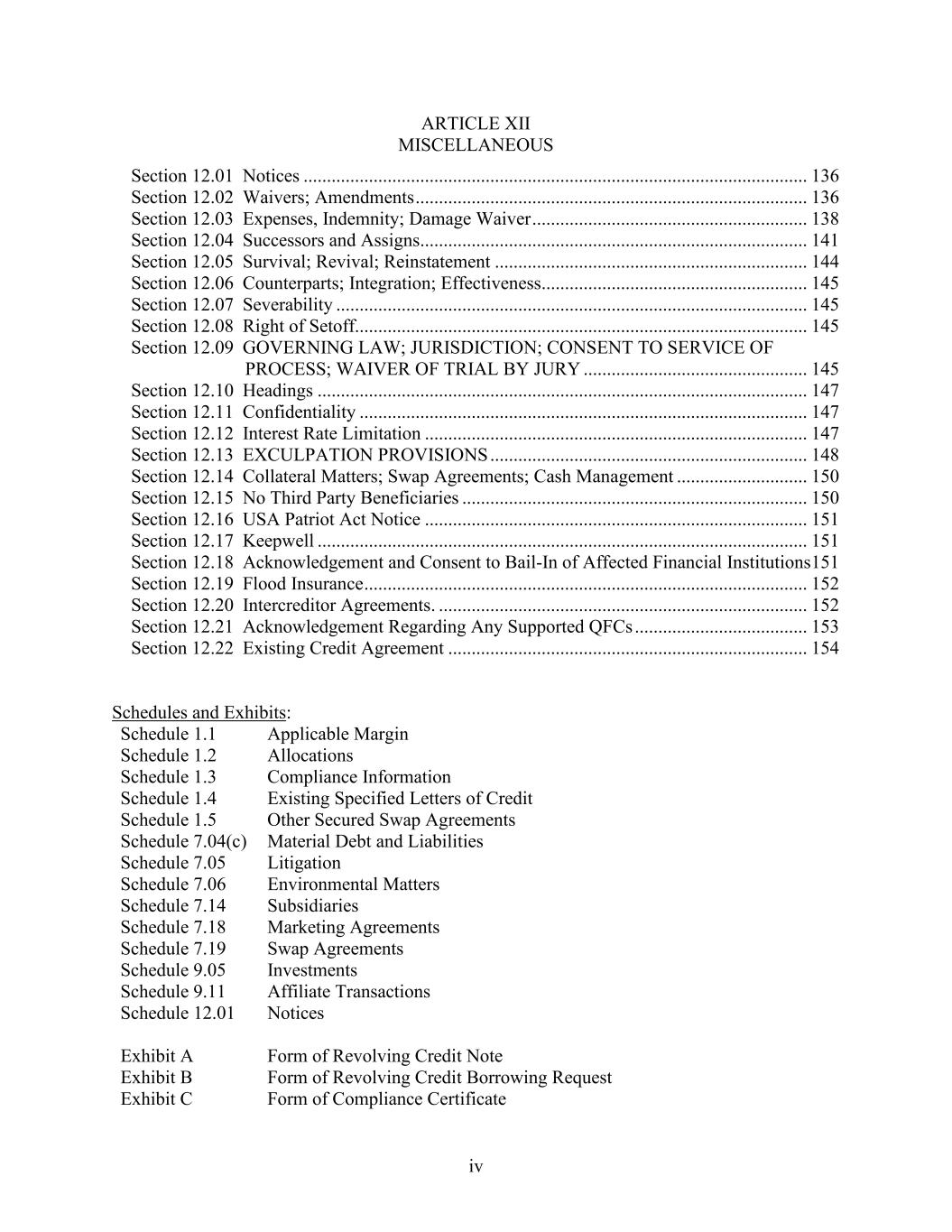 iv ARTICLE XII MISCELLANEOUS Section 12.01 Notices ............................................................................................................ 136 Section 12.02 Waivers; Amendments .................................................................................... 136 Section 12.03 Expenses, Indemnity; Damage Waiver ........................................................... 138 Section 12.04 Successors and Assigns................................................................................... 141 Section 12.05 Survival; Revival; Reinstatement ................................................................... 144 Section 12.06 Counterparts; Integration; Effectiveness ......................................................... 145 Section 12.07 Severability ..................................................................................................... 145 Section 12.08 Right of Setoff................................................................................................. 145 Section 12.09 GOVERNING LAW; JURISDICTION; CONSENT TO SERVICE OF PROCESS; WAIVER OF TRIAL BY JURY ................................................ 145 Section 12.10 Headings ......................................................................................................... 147 Section 12.11 Confidentiality ................................................................................................ 147 Section 12.12 Interest Rate Limitation .................................................................................. 147 Section 12.13 EXCULPATION PROVISIONS .................................................................... 148 Section 12.14 Collateral Matters; Swap Agreements; Cash Management ............................ 150 Section 12.15 No Third Party Beneficiaries .......................................................................... 150 Section 12.16 USA Patriot Act Notice .................................................................................. 151 Section 12.17 Keepwell ......................................................................................................... 151 Section 12.18 Acknowledgement and Consent to Bail-In of Affected Financial Institutions 151 Section 12.19 Flood Insurance ............................................................................................... 152 Section 12.20 Intercreditor Agreements. ............................................................................... 152 Section 12.21 Acknowledgement Regarding Any Supported QFCs ..................................... 153 Section 12.22 Existing Credit Agreement ............................................................................. 154 Schedules and Exhibits: Schedule 1.1 Applicable Margin Schedule 1.2 Allocations Schedule 1.3 Compliance Information Schedule 1.4 Schedule 1.5 Schedule 7.04(c) Existing Specified Letters of Credit Other Secured Swap Agreements Material Debt and Liabilities Schedule 7.05 Litigation Schedule 7.06 Environmental Matters Schedule 7.14 Subsidiaries Schedule 7.18 Marketing Agreements Schedule 7.19 Swap Agreements Schedule 9.05 Investments Schedule 9.11 Affiliate Transactions Schedule 12.01 Notices Exhibit A Form of Revolving Credit Note Exhibit B Form of Revolving Credit Borrowing Request Exhibit C Form of Compliance Certificate