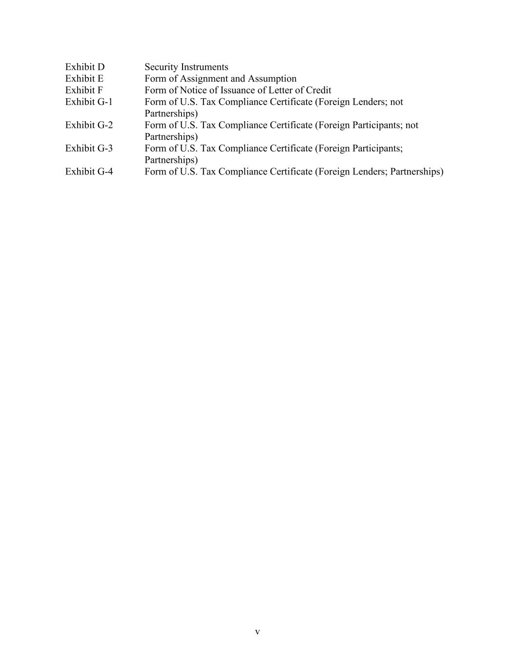 v Exhibit D Security Instruments Exhibit E Form of Assignment and Assumption Exhibit F Form of Notice of Issuance of Letter of Credit Exhibit G-1 Form of U.S. Tax Compliance Certificate (Foreign Lenders; not Partnerships) Exhibit G-2 Form of U.S. Tax Compliance Certificate (Foreign Participants; not Partnerships) Exhibit G-3 Form of U.S. Tax Compliance Certificate (Foreign Participants; Partnerships) Exhibit G-4 Form of U.S. Tax Compliance Certificate (Foreign Lenders; Partnerships)