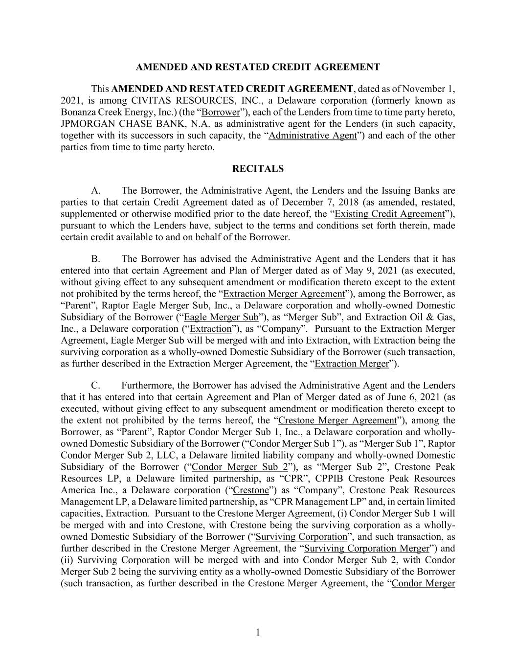 1 AMENDED AND RESTATED CREDIT AGREEMENT This AMENDED AND RESTATED CREDIT AGREEMENT, dated as of November 1, 2021, is among CIVITAS RESOURCES, INC., a Delaware corporation (formerly known as Bonanza Creek Energy, Inc.) (the “Borrower”), each of the Lenders from time to time party hereto, JPMORGAN CHASE BANK, N.A. as administrative agent for the Lenders (in such capacity, together with its successors in such capacity, the “Administrative Agent”) and each of the other parties from time to time party hereto. RECITALS A. The Borrower, the Administrative Agent, the Lenders and the Issuing Banks are parties to that certain Credit Agreement dated as of December 7, 2018 (as amended, restated, supplemented or otherwise modified prior to the date hereof, the “Existing Credit Agreement”), pursuant to which the Lenders have, subject to the terms and conditions set forth therein, made certain credit available to and on behalf of the Borrower. B. The Borrower has advised the Administrative Agent and the Lenders that it has entered into that certain Agreement and Plan of Merger dated as of May 9, 2021 (as executed, without giving effect to any subsequent amendment or modification thereto except to the extent not prohibited by the terms hereof, the “Extraction Merger Agreement”), among the Borrower, as “Parent”, Raptor Eagle Merger Sub, Inc., a Delaware corporation and wholly-owned Domestic Subsidiary of the Borrower (“Eagle Merger Sub”), as “Merger Sub”, and Extraction Oil & Gas, Inc., a Delaware corporation (“Extraction”), as “Company”. Pursuant to the Extraction Merger Agreement, Eagle Merger Sub will be merged with and into Extraction, with Extraction being the surviving corporation as a wholly-owned Domestic Subsidiary of the Borrower (such transaction, as further described in the Extraction Merger Agreement, the “Extraction Merger”). C. Furthermore, the Borrower has advised the Administrative Agent and the Lenders that it has entered into that certain Agreement and Plan of Merger dated as of June 6, 2021 (as executed, without giving effect to any subsequent amendment or modification thereto except to the extent not prohibited by the terms hereof, the “Crestone Merger Agreement”), among the Borrower, as “Parent”, Raptor Condor Merger Sub 1, Inc., a Delaware corporation and wholly- owned Domestic Subsidiary of the Borrower (“Condor Merger Sub 1”), as “Merger Sub 1”, Raptor Condor Merger Sub 2, LLC, a Delaware limited liability company and wholly-owned Domestic Subsidiary of the Borrower (“Condor Merger Sub 2”), as “Merger Sub 2”, Crestone Peak Resources LP, a Delaware limited partnership, as “CPR”, CPPIB Crestone Peak Resources America Inc., a Delaware corporation (“Crestone”) as “Company”, Crestone Peak Resources Management LP, a Delaware limited partnership, as “CPR Management LP” and, in certain limited capacities, Extraction. Pursuant to the Crestone Merger Agreement, (i) Condor Merger Sub 1 will be merged with and into Crestone, with Crestone being the surviving corporation as a wholly- owned Domestic Subsidiary of the Borrower (“Surviving Corporation”, and such transaction, as further described in the Crestone Merger Agreement, the “Surviving Corporation Merger”) and (ii) Surviving Corporation will be merged with and into Condor Merger Sub 2, with Condor Merger Sub 2 being the surviving entity as a wholly-owned Domestic Subsidiary of the Borrower (such transaction, as further described in the Crestone Merger Agreement, the “Condor Merger