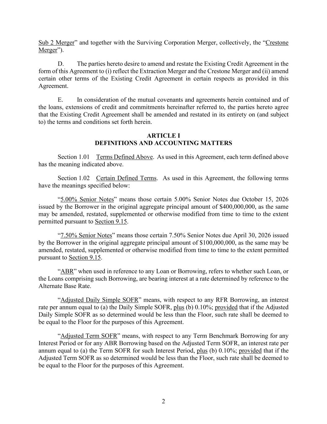 2 Sub 2 Merger” and together with the Surviving Corporation Merger, collectively, the “Crestone Merger”). D. The parties hereto desire to amend and restate the Existing Credit Agreement in the form of this Agreement to (i) reflect the Extraction Merger and the Crestone Merger and (ii) amend certain other terms of the Existing Credit Agreement in certain respects as provided in this Agreement. E. In consideration of the mutual covenants and agreements herein contained and of the loans, extensions of credit and commitments hereinafter referred to, the parties hereto agree that the Existing Credit Agreement shall be amended and restated in its entirety on (and subject to) the terms and conditions set forth herein. ARTICLE I DEFINITIONS AND ACCOUNTING MATTERS Section 1.01 Terms Defined Above. As used in this Agreement, each term defined above has the meaning indicated above. Section 1.02 Certain Defined Terms. As used in this Agreement, the following terms have the meanings specified below: “5.00% Senior Notes” means those certain 5.00% Senior Notes due October 15, 2026 issued by the Borrower in the original aggregate principal amount of $400,000,000, as the same may be amended, restated, supplemented or otherwise modified from time to time to the extent permitted pursuant to Section 9.15. “7.50% Senior Notes” means those certain 7.50% Senior Notes due April 30, 2026 issued by the Borrower in the original aggregate principal amount of $100,000,000, as the same may be amended, restated, supplemented or otherwise modified from time to time to the extent permitted pursuant to Section 9.15. “ABR” when used in reference to any Loan or Borrowing, refers to whether such Loan, or the Loans comprising such Borrowing, are bearing interest at a rate determined by reference to the Alternate Base Rate. “Adjusted Daily Simple SOFR” means, with respect to any RFR Borrowing, an interest rate per annum equal to (a) the Daily Simple SOFR, plus (b) 0.10%; provided that if the Adjusted Daily Simple SOFR as so determined would be less than the Floor, such rate shall be deemed to be equal to the Floor for the purposes of this Agreement. “Adjusted Term SOFR” means, with respect to any Term Benchmark Borrowing for any Interest Period or for any ABR Borrowing based on the Adjusted Term SOFR, an interest rate per annum equal to (a) the Term SOFR for such Interest Period, plus (b) 0.10%; provided that if the Adjusted Term SOFR as so determined would be less than the Floor, such rate shall be deemed to be equal to the Floor for the purposes of this Agreement.