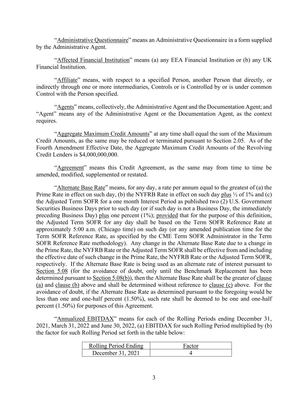 3 “Administrative Questionnaire” means an Administrative Questionnaire in a form supplied by the Administrative Agent. “Affected Financial Institution” means (a) any EEA Financial Institution or (b) any UK Financial Institution. “Affiliate” means, with respect to a specified Person, another Person that directly, or indirectly through one or more intermediaries, Controls or is Controlled by or is under common Control with the Person specified. “Agents” means, collectively, the Administrative Agent and the Documentation Agent; and “Agent” means any of the Administrative Agent or the Documentation Agent, as the context requires. “Aggregate Maximum Credit Amounts” at any time shall equal the sum of the Maximum Credit Amounts, as the same may be reduced or terminated pursuant to Section 2.05. As of the Fourth Amendment Effective Date, the Aggregate Maximum Credit Amounts of the Revolving Credit Lenders is $4,000,000,000. “Agreement” means this Credit Agreement, as the same may from time to time be amended, modified, supplemented or restated. “Alternate Base Rate” means, for any day, a rate per annum equal to the greatest of (a) the Prime Rate in effect on such day, (b) the NYFRB Rate in effect on such day plus ½ of 1% and (c) the Adjusted Term SOFR for a one month Interest Period as published two (2) U.S. Government Securities Business Days prior to such day (or if such day is not a Business Day, the immediately preceding Business Day) plus one percent (1%); provided that for the purpose of this definition, the Adjusted Term SOFR for any day shall be based on the Term SOFR Reference Rate at approximately 5:00 a.m. (Chicago time) on such day (or any amended publication time for the Term SOFR Reference Rate, as specified by the CME Term SOFR Administrator in the Term SOFR Reference Rate methodology). Any change in the Alternate Base Rate due to a change in the Prime Rate, the NYFRB Rate or the Adjusted Term SOFR shall be effective from and including the effective date of such change in the Prime Rate, the NYFRB Rate or the Adjusted Term SOFR, respectively. If the Alternate Base Rate is being used as an alternate rate of interest pursuant to Section 5.08 (for the avoidance of doubt, only until the Benchmark Replacement has been determined pursuant to Section 5.08(b)), then the Alternate Base Rate shall be the greater of clause (a) and clause (b) above and shall be determined without reference to clause (c) above. For the avoidance of doubt, if the Alternate Base Rate as determined pursuant to the foregoing would be less than one and one-half percent (1.50%), such rate shall be deemed to be one and one-half percent (1.50%) for purposes of this Agreement. “Annualized EBITDAX” means for each of the Rolling Periods ending December 31, 2021, March 31, 2022 and June 30, 2022, (a) EBITDAX for such Rolling Period multiplied by (b) the factor for such Rolling Period set forth in the table below: Rolling Period Ending Factor December 31, 2021 4
