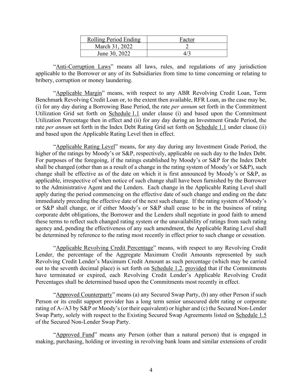 4 Rolling Period Ending Factor March 31, 2022 2 June 30, 2022 4/3 “Anti-Corruption Laws” means all laws, rules, and regulations of any jurisdiction applicable to the Borrower or any of its Subsidiaries from time to time concerning or relating to bribery, corruption or money laundering. “Applicable Margin” means, with respect to any ABR Revolving Credit Loan, Term Benchmark Revolving Credit Loan or, to the extent then available, RFR Loan, as the case may be, (i) for any day during a Borrowing Base Period, the rate per annum set forth in the Commitment Utilization Grid set forth on Schedule 1.1 under clause (i) and based upon the Commitment Utilization Percentage then in effect and (ii) for any day during an Investment Grade Period, the rate per annum set forth in the Index Debt Rating Grid set forth on Schedule 1.1 under clause (ii) and based upon the Applicable Rating Level then in effect. “Applicable Rating Level” means, for any day during any Investment Grade Period, the higher of the ratings by Moody’s or S&P, respectively, applicable on such day to the Index Debt. For purposes of the foregoing, if the ratings established by Moody’s or S&P for the Index Debt shall be changed (other than as a result of a change in the rating system of Moody’s or S&P), such change shall be effective as of the date on which it is first announced by Moody’s or S&P, as applicable, irrespective of when notice of such change shall have been furnished by the Borrower to the Administrative Agent and the Lenders. Each change in the Applicable Rating Level shall apply during the period commencing on the effective date of such change and ending on the date immediately preceding the effective date of the next such change. If the rating system of Moody’s or S&P shall change, or if either Moody’s or S&P shall cease to be in the business of rating corporate debt obligations, the Borrower and the Lenders shall negotiate in good faith to amend these terms to reflect such changed rating system or the unavailability of ratings from such rating agency and, pending the effectiveness of any such amendment, the Applicable Rating Level shall be determined by reference to the rating most recently in effect prior to such change or cessation. “Applicable Revolving Credit Percentage” means, with respect to any Revolving Credit Lender, the percentage of the Aggregate Maximum Credit Amounts represented by such Revolving Credit Lender’s Maximum Credit Amount as such percentage (which may be carried out to the seventh decimal place) is set forth on Schedule 1.2, provided that if the Commitments have terminated or expired, each Revolving Credit Lender’s Applicable Revolving Credit Percentages shall be determined based upon the Commitments most recently in effect. “Approved Counterparty” means (a) any Secured Swap Party, (b) any other Person if such Person or its credit support provider has a long term senior unsecured debt rating or corporate rating of A-/A3 by S&P or Moody’s (or their equivalent) or higher and (c) the Secured Non-Lender Swap Party, solely with respect to the Existing Secured Swap Agreements listed on Schedule 1.5 of the Secured Non-Lender Swap Party. “Approved Fund” means any Person (other than a natural person) that is engaged in making, purchasing, holding or investing in revolving bank loans and similar extensions of credit
