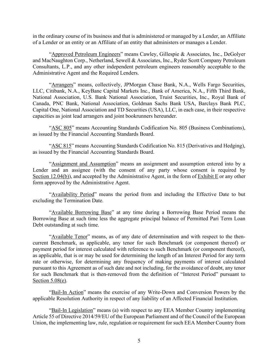5 in the ordinary course of its business and that is administered or managed by a Lender, an Affiliate of a Lender or an entity or an Affiliate of an entity that administers or manages a Lender. “Approved Petroleum Engineers” means Cawley, Gillespie & Associates, Inc., DeGolyer and MacNaughton Corp., Netherland, Sewell & Associates, Inc., Ryder Scott Company Petroleum Consultants, L.P., and any other independent petroleum engineers reasonably acceptable to the Administrative Agent and the Required Lenders. “Arrangers” means, collectively, JPMorgan Chase Bank, N.A., Wells Fargo Securities, LLC, Citibank, N.A., KeyBanc Capital Markets Inc., Bank of America, N.A., Fifth Third Bank, National Association, U.S. Bank National Association, Truist Securities, Inc., Royal Bank of Canada, PNC Bank, National Association, Goldman Sachs Bank USA, Barclays Bank PLC, Capital One, National Association and TD Securities (USA), LLC, in each case, in their respective capacities as joint lead arrangers and joint bookrunners hereunder. “ASC 805” means Accounting Standards Codification No. 805 (Business Combinations), as issued by the Financial Accounting Standards Board. “ASC 815” means Accounting Standards Codification No. 815 (Derivatives and Hedging), as issued by the Financial Accounting Standards Board. “Assignment and Assumption” means an assignment and assumption entered into by a Lender and an assignee (with the consent of any party whose consent is required by Section 12.04(b)), and accepted by the Administrative Agent, in the form of Exhibit E or any other form approved by the Administrative Agent. “Availability Period” means the period from and including the Effective Date to but excluding the Termination Date. “Available Borrowing Base” at any time during a Borrowing Base Period means the Borrowing Base at such time less the aggregate principal balance of Permitted Pari Term Loan Debt outstanding at such time. “Available Tenor” means, as of any date of determination and with respect to the then- current Benchmark, as applicable, any tenor for such Benchmark (or component thereof) or payment period for interest calculated with reference to such Benchmark (or component thereof), as applicable, that is or may be used for determining the length of an Interest Period for any term rate or otherwise, for determining any frequency of making payments of interest calculated pursuant to this Agreement as of such date and not including, for the avoidance of doubt, any tenor for such Benchmark that is then-removed from the definition of “Interest Period” pursuant to Section 5.08(e). “Bail-In Action” means the exercise of any Write-Down and Conversion Powers by the applicable Resolution Authority in respect of any liability of an Affected Financial Institution. “Bail-In Legislation” means (a) with respect to any EEA Member Country implementing Article 55 of Directive 2014/59/EU of the European Parliament and of the Council of the European Union, the implementing law, rule, regulation or requirement for such EEA Member Country from