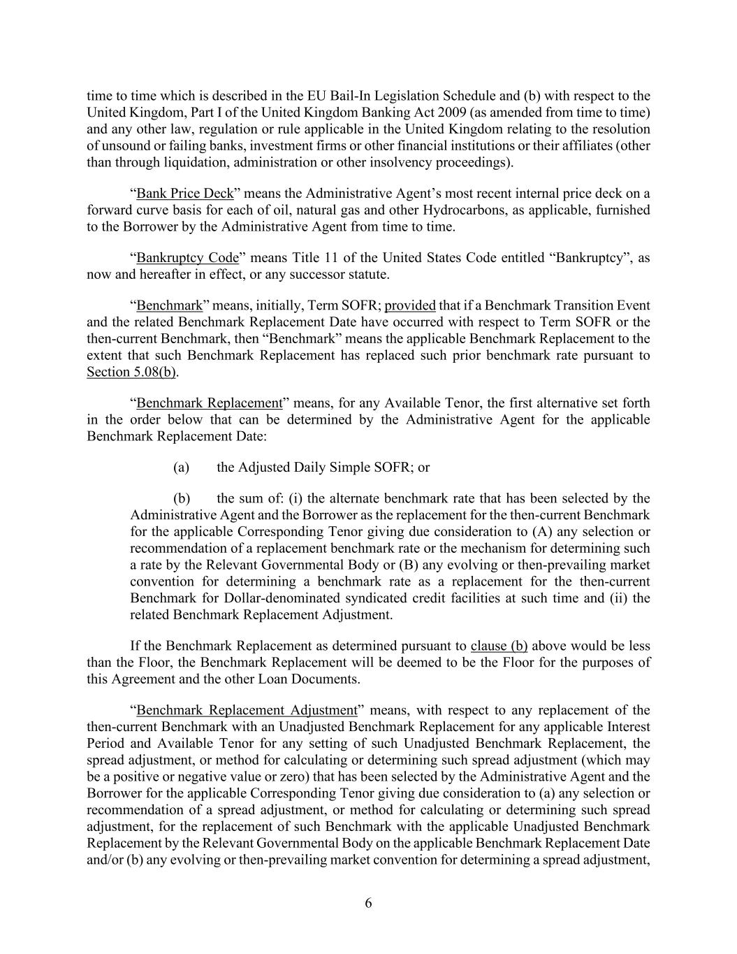 6 time to time which is described in the EU Bail-In Legislation Schedule and (b) with respect to the United Kingdom, Part I of the United Kingdom Banking Act 2009 (as amended from time to time) and any other law, regulation or rule applicable in the United Kingdom relating to the resolution of unsound or failing banks, investment firms or other financial institutions or their affiliates (other than through liquidation, administration or other insolvency proceedings). “Bank Price Deck” means the Administrative Agent’s most recent internal price deck on a forward curve basis for each of oil, natural gas and other Hydrocarbons, as applicable, furnished to the Borrower by the Administrative Agent from time to time. “Bankruptcy Code” means Title 11 of the United States Code entitled “Bankruptcy”, as now and hereafter in effect, or any successor statute. “Benchmark” means, initially, Term SOFR; provided that if a Benchmark Transition Event and the related Benchmark Replacement Date have occurred with respect to Term SOFR or the then-current Benchmark, then “Benchmark” means the applicable Benchmark Replacement to the extent that such Benchmark Replacement has replaced such prior benchmark rate pursuant to Section 5.08(b). “Benchmark Replacement” means, for any Available Tenor, the first alternative set forth in the order below that can be determined by the Administrative Agent for the applicable Benchmark Replacement Date: (a) the Adjusted Daily Simple SOFR; or (b) the sum of: (i) the alternate benchmark rate that has been selected by the Administrative Agent and the Borrower as the replacement for the then-current Benchmark for the applicable Corresponding Tenor giving due consideration to (A) any selection or recommendation of a replacement benchmark rate or the mechanism for determining such a rate by the Relevant Governmental Body or (B) any evolving or then-prevailing market convention for determining a benchmark rate as a replacement for the then-current Benchmark for Dollar-denominated syndicated credit facilities at such time and (ii) the related Benchmark Replacement Adjustment. If the Benchmark Replacement as determined pursuant to clause (b) above would be less than the Floor, the Benchmark Replacement will be deemed to be the Floor for the purposes of this Agreement and the other Loan Documents. “Benchmark Replacement Adjustment” means, with respect to any replacement of the then-current Benchmark with an Unadjusted Benchmark Replacement for any applicable Interest Period and Available Tenor for any setting of such Unadjusted Benchmark Replacement, the spread adjustment, or method for calculating or determining such spread adjustment (which may be a positive or negative value or zero) that has been selected by the Administrative Agent and the Borrower for the applicable Corresponding Tenor giving due consideration to (a) any selection or recommendation of a spread adjustment, or method for calculating or determining such spread adjustment, for the replacement of such Benchmark with the applicable Unadjusted Benchmark Replacement by the Relevant Governmental Body on the applicable Benchmark Replacement Date and/or (b) any evolving or then-prevailing market convention for determining a spread adjustment,