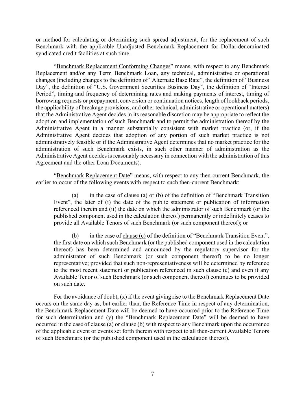 7 or method for calculating or determining such spread adjustment, for the replacement of such Benchmark with the applicable Unadjusted Benchmark Replacement for Dollar-denominated syndicated credit facilities at such time. “Benchmark Replacement Conforming Changes” means, with respect to any Benchmark Replacement and/or any Term Benchmark Loan, any technical, administrative or operational changes (including changes to the definition of “Alternate Base Rate”, the definition of “Business Day”, the definition of “U.S. Government Securities Business Day”, the definition of “Interest Period”, timing and frequency of determining rates and making payments of interest, timing of borrowing requests or prepayment, conversion or continuation notices, length of lookback periods, the applicability of breakage provisions, and other technical, administrative or operational matters) that the Administrative Agent decides in its reasonable discretion may be appropriate to reflect the adoption and implementation of such Benchmark and to permit the administration thereof by the Administrative Agent in a manner substantially consistent with market practice (or, if the Administrative Agent decides that adoption of any portion of such market practice is not administratively feasible or if the Administrative Agent determines that no market practice for the administration of such Benchmark exists, in such other manner of administration as the Administrative Agent decides is reasonably necessary in connection with the administration of this Agreement and the other Loan Documents). “Benchmark Replacement Date” means, with respect to any then-current Benchmark, the earlier to occur of the following events with respect to such then-current Benchmark: (a) in the case of clause (a) or (b) of the definition of “Benchmark Transition Event”, the later of (i) the date of the public statement or publication of information referenced therein and (ii) the date on which the administrator of such Benchmark (or the published component used in the calculation thereof) permanently or indefinitely ceases to provide all Available Tenors of such Benchmark (or such component thereof); or (b) in the case of clause (c) of the definition of “Benchmark Transition Event”, the first date on which such Benchmark (or the published component used in the calculation thereof) has been determined and announced by the regulatory supervisor for the administrator of such Benchmark (or such component thereof) to be no longer representative; provided that such non-representativeness will be determined by reference to the most recent statement or publication referenced in such clause (c) and even if any Available Tenor of such Benchmark (or such component thereof) continues to be provided on such date. For the avoidance of doubt, (x) if the event giving rise to the Benchmark Replacement Date occurs on the same day as, but earlier than, the Reference Time in respect of any determination, the Benchmark Replacement Date will be deemed to have occurred prior to the Reference Time for such determination and (y) the “Benchmark Replacement Date” will be deemed to have occurred in the case of clause (a) or clause (b) with respect to any Benchmark upon the occurrence of the applicable event or events set forth therein with respect to all then-current Available Tenors of such Benchmark (or the published component used in the calculation thereof).