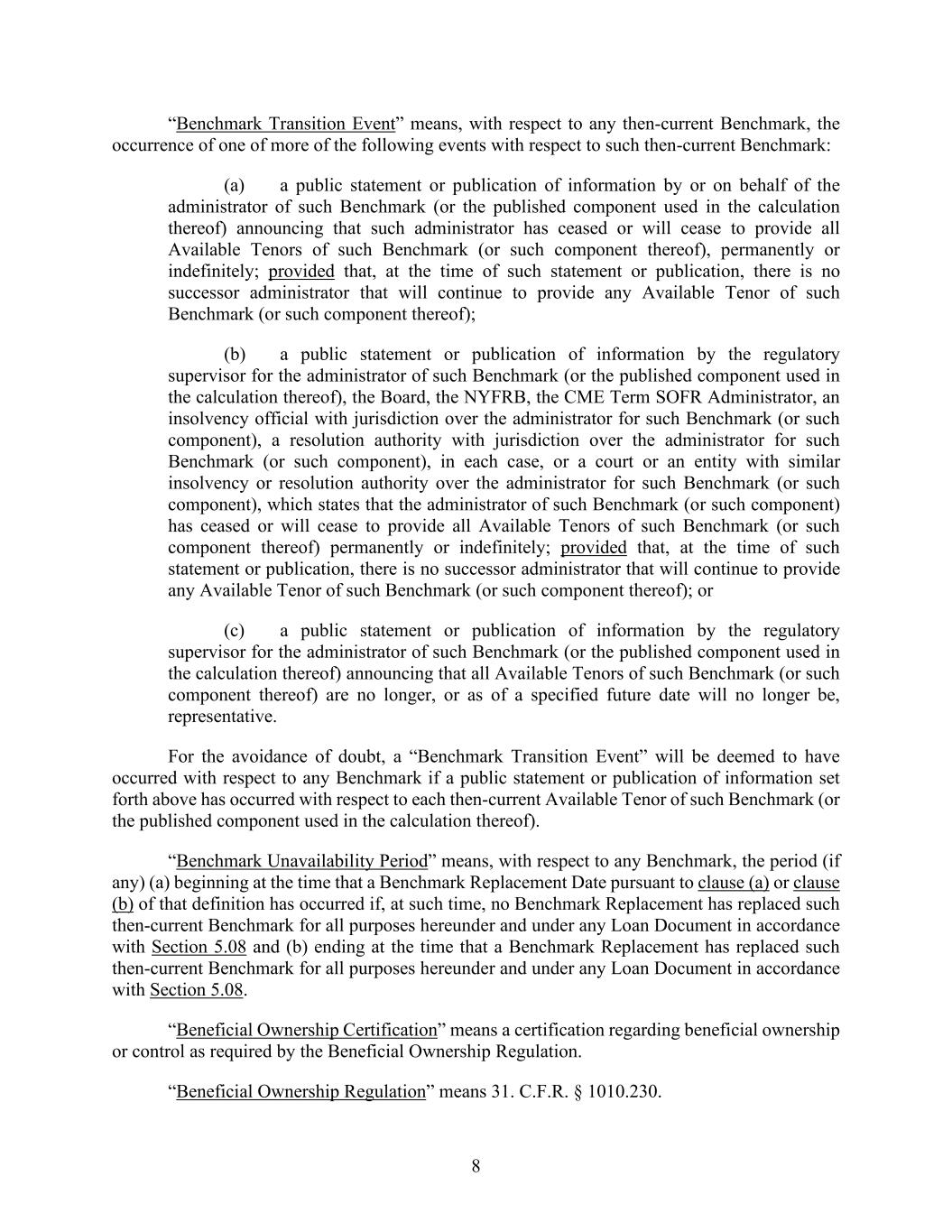 8 “Benchmark Transition Event” means, with respect to any then-current Benchmark, the occurrence of one of more of the following events with respect to such then-current Benchmark: (a) a public statement or publication of information by or on behalf of the administrator of such Benchmark (or the published component used in the calculation thereof) announcing that such administrator has ceased or will cease to provide all Available Tenors of such Benchmark (or such component thereof), permanently or indefinitely; provided that, at the time of such statement or publication, there is no successor administrator that will continue to provide any Available Tenor of such Benchmark (or such component thereof); (b) a public statement or publication of information by the regulatory supervisor for the administrator of such Benchmark (or the published component used in the calculation thereof), the Board, the NYFRB, the CME Term SOFR Administrator, an insolvency official with jurisdiction over the administrator for such Benchmark (or such component), a resolution authority with jurisdiction over the administrator for such Benchmark (or such component), in each case, or a court or an entity with similar insolvency or resolution authority over the administrator for such Benchmark (or such component), which states that the administrator of such Benchmark (or such component) has ceased or will cease to provide all Available Tenors of such Benchmark (or such component thereof) permanently or indefinitely; provided that, at the time of such statement or publication, there is no successor administrator that will continue to provide any Available Tenor of such Benchmark (or such component thereof); or (c) a public statement or publication of information by the regulatory supervisor for the administrator of such Benchmark (or the published component used in the calculation thereof) announcing that all Available Tenors of such Benchmark (or such component thereof) are no longer, or as of a specified future date will no longer be, representative. For the avoidance of doubt, a “Benchmark Transition Event” will be deemed to have occurred with respect to any Benchmark if a public statement or publication of information set forth above has occurred with respect to each then-current Available Tenor of such Benchmark (or the published component used in the calculation thereof). “Benchmark Unavailability Period” means, with respect to any Benchmark, the period (if any) (a) beginning at the time that a Benchmark Replacement Date pursuant to clause (a) or clause (b) of that definition has occurred if, at such time, no Benchmark Replacement has replaced such then-current Benchmark for all purposes hereunder and under any Loan Document in accordance with Section 5.08 and (b) ending at the time that a Benchmark Replacement has replaced such then-current Benchmark for all purposes hereunder and under any Loan Document in accordance with Section 5.08. “Beneficial Ownership Certification” means a certification regarding beneficial ownership or control as required by the Beneficial Ownership Regulation. “Beneficial Ownership Regulation” means 31. C.F.R. § 1010.230.
