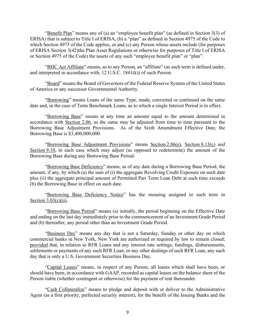 9 “Benefit Plan” means any of (a) an “employee benefit plan” (as defined in Section 3(3) of ERISA) that is subject to Title I of ERISA, (b) a “plan” as defined in Section 4975 of the Code to which Section 4975 of the Code applies, or and (c) any Person whose assets include (for purposes of ERISA Section 3(42)the Plan Asset Regulations or otherwise for purposes of Title I of ERISA or Section 4975 of the Code) the assets of any such “employee benefit plan” or “plan”. “BHC Act Affiliate” means, as to any Person, an “affiliate” (as such term is defined under, and interpreted in accordance with, 12 U.S.C. 1841(k)) of such Person. “Board” means the Board of Governors of the Federal Reserve System of the United States of America or any successor Governmental Authority. “Borrowing” means Loans of the same Type, made, converted or continued on the same date and, in the case of Term Benchmark Loans, as to which a single Interest Period is in effect. “Borrowing Base” means at any time an amount equal to the amount determined in accordance with Section 2.06, as the same may be adjusted from time to time pursuant to the Borrowing Base Adjustment Provisions. As of the Sixth Amendment Effective Date, the Borrowing Base is $3,400,000,000. “Borrowing Base Adjustment Provisions” means Section 2.06(e), Section 8.13(c) and Section 9.10, in each case which may adjust (as opposed to redetermine) the amount of the Borrowing Base during any Borrowing Base Period. “Borrowing Base Deficiency” means, as of any date during a Borrowing Base Period, the amount, if any, by which (a) the sum of (i) the aggregate Revolving Credit Exposure on such date plus (ii) the aggregate principal amount of Permitted Pari Term Loan Debt at such time exceeds (b) the Borrowing Base in effect on such date. “Borrowing Base Deficiency Notice” has the meaning assigned to such term in Section 3.03(c)(ii). “Borrowing Base Period” means (a) initially, the period beginning on the Effective Date and ending on the last day immediately prior to the commencement of an Investment Grade Period and (b) thereafter, any period other than an Investment Grade Period. “Business Day” means any day that is not a Saturday, Sunday or other day on which commercial banks in New York, New York are authorized or required by law to remain closed; provided that, in relation to RFR Loans and any interest rate settings, fundings, disbursements, settlements or payments of any such RFR Loan, or any other dealings of such RFR Loan, any such day that is only a U.S. Government Securities Business Day. “Capital Leases” means, in respect of any Person, all leases which shall have been, or should have been, in accordance with GAAP, recorded as capital leases on the balance sheet of the Person liable (whether contingent or otherwise) for the payment of rent thereunder. “Cash Collateralize” means to pledge and deposit with or deliver to the Administrative Agent (as a first priority, perfected security interest), for the benefit of the Issuing Banks and the