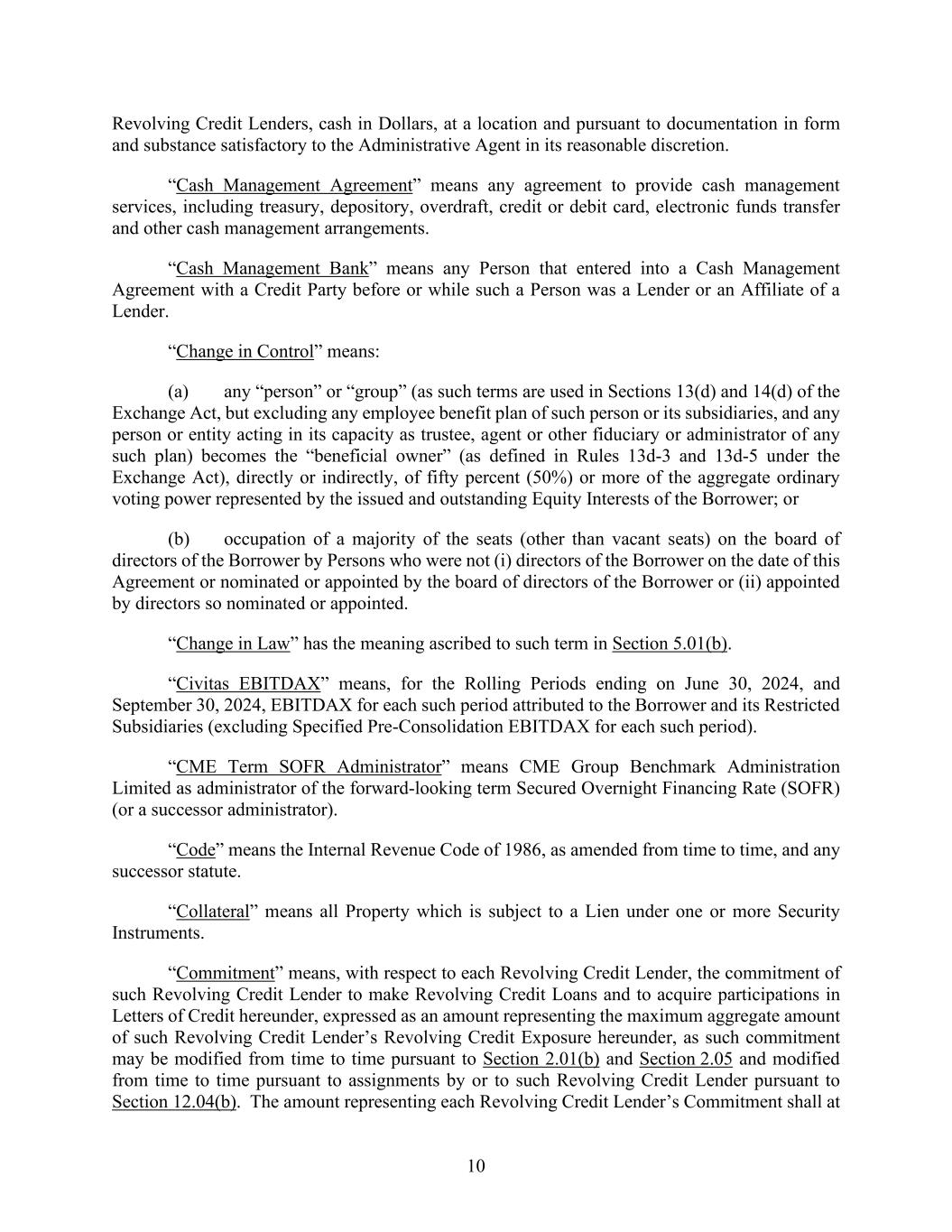10 Revolving Credit Lenders, cash in Dollars, at a location and pursuant to documentation in form and substance satisfactory to the Administrative Agent in its reasonable discretion. “Cash Management Agreement” means any agreement to provide cash management services, including treasury, depository, overdraft, credit or debit card, electronic funds transfer and other cash management arrangements. “Cash Management Bank” means any Person that entered into a Cash Management Agreement with a Credit Party before or while such a Person was a Lender or an Affiliate of a Lender. “Change in Control” means: (a) any “person” or “group” (as such terms are used in Sections 13(d) and 14(d) of the Exchange Act, but excluding any employee benefit plan of such person or its subsidiaries, and any person or entity acting in its capacity as trustee, agent or other fiduciary or administrator of any such plan) becomes the “beneficial owner” (as defined in Rules 13d-3 and 13d-5 under the Exchange Act), directly or indirectly, of fifty percent (50%) or more of the aggregate ordinary voting power represented by the issued and outstanding Equity Interests of the Borrower; or (b) occupation of a majority of the seats (other than vacant seats) on the board of directors of the Borrower by Persons who were not (i) directors of the Borrower on the date of this Agreement or nominated or appointed by the board of directors of the Borrower or (ii) appointed by directors so nominated or appointed. “Change in Law” has the meaning ascribed to such term in Section 5.01(b). “Civitas EBITDAX” means, for the Rolling Periods ending on June 30, 2024, and September 30, 2024, EBITDAX for each such period attributed to the Borrower and its Restricted Subsidiaries (excluding Specified Pre-Consolidation EBITDAX for each such period). “CME Term SOFR Administrator” means CME Group Benchmark Administration Limited as administrator of the forward-looking term Secured Overnight Financing Rate (SOFR) (or a successor administrator). “Code” means the Internal Revenue Code of 1986, as amended from time to time, and any successor statute. “Collateral” means all Property which is subject to a Lien under one or more Security Instruments. “Commitment” means, with respect to each Revolving Credit Lender, the commitment of such Revolving Credit Lender to make Revolving Credit Loans and to acquire participations in Letters of Credit hereunder, expressed as an amount representing the maximum aggregate amount of such Revolving Credit Lender’s Revolving Credit Exposure hereunder, as such commitment may be modified from time to time pursuant to Section 2.01(b) and Section 2.05 and modified from time to time pursuant to assignments by or to such Revolving Credit Lender pursuant to Section 12.04(b). The amount representing each Revolving Credit Lender’s Commitment shall at