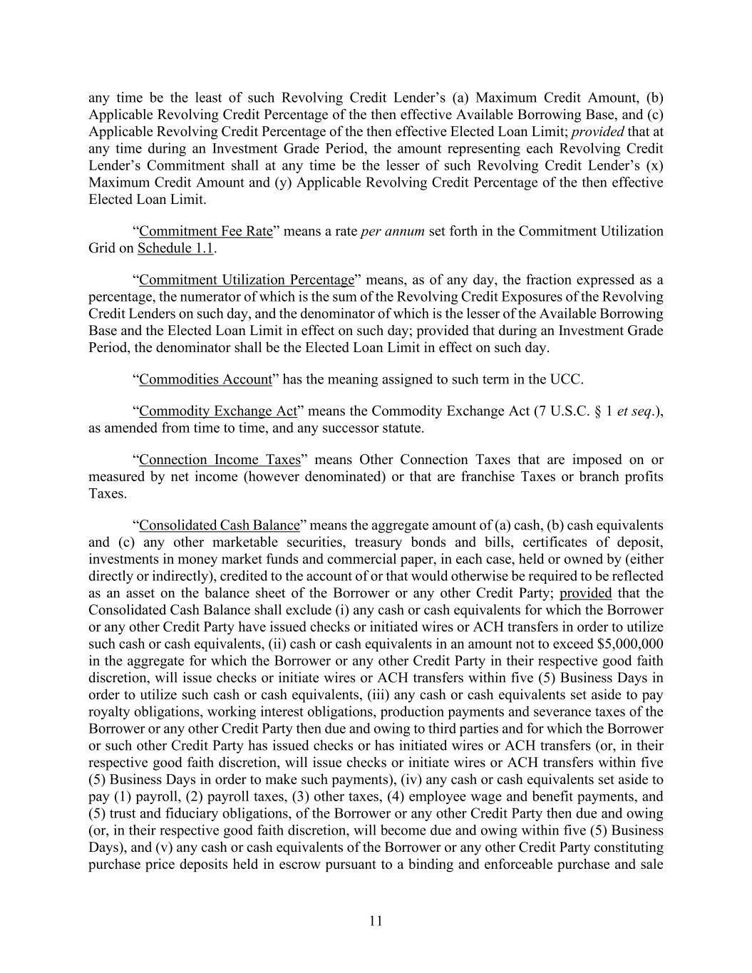 11 any time be the least of such Revolving Credit Lender’s (a) Maximum Credit Amount, (b) Applicable Revolving Credit Percentage of the then effective Available Borrowing Base, and (c) Applicable Revolving Credit Percentage of the then effective Elected Loan Limit; provided that at any time during an Investment Grade Period, the amount representing each Revolving Credit Lender’s Commitment shall at any time be the lesser of such Revolving Credit Lender’s (x) Maximum Credit Amount and (y) Applicable Revolving Credit Percentage of the then effective Elected Loan Limit. “Commitment Fee Rate” means a rate per annum set forth in the Commitment Utilization Grid on Schedule 1.1. “Commitment Utilization Percentage” means, as of any day, the fraction expressed as a percentage, the numerator of which is the sum of the Revolving Credit Exposures of the Revolving Credit Lenders on such day, and the denominator of which is the lesser of the Available Borrowing Base and the Elected Loan Limit in effect on such day; provided that during an Investment Grade Period, the denominator shall be the Elected Loan Limit in effect on such day. “Commodities Account” has the meaning assigned to such term in the UCC. “Commodity Exchange Act” means the Commodity Exchange Act (7 U.S.C. § 1 et seq.), as amended from time to time, and any successor statute. “Connection Income Taxes” means Other Connection Taxes that are imposed on or measured by net income (however denominated) or that are franchise Taxes or branch profits Taxes. “Consolidated Cash Balance” means the aggregate amount of (a) cash, (b) cash equivalents and (c) any other marketable securities, treasury bonds and bills, certificates of deposit, investments in money market funds and commercial paper, in each case, held or owned by (either directly or indirectly), credited to the account of or that would otherwise be required to be reflected as an asset on the balance sheet of the Borrower or any other Credit Party; provided that the Consolidated Cash Balance shall exclude (i) any cash or cash equivalents for which the Borrower or any other Credit Party have issued checks or initiated wires or ACH transfers in order to utilize such cash or cash equivalents, (ii) cash or cash equivalents in an amount not to exceed $5,000,000 in the aggregate for which the Borrower or any other Credit Party in their respective good faith discretion, will issue checks or initiate wires or ACH transfers within five (5) Business Days in order to utilize such cash or cash equivalents, (iii) any cash or cash equivalents set aside to pay royalty obligations, working interest obligations, production payments and severance taxes of the Borrower or any other Credit Party then due and owing to third parties and for which the Borrower or such other Credit Party has issued checks or has initiated wires or ACH transfers (or, in their respective good faith discretion, will issue checks or initiate wires or ACH transfers within five (5) Business Days in order to make such payments), (iv) any cash or cash equivalents set aside to pay (1) payroll, (2) payroll taxes, (3) other taxes, (4) employee wage and benefit payments, and (5) trust and fiduciary obligations, of the Borrower or any other Credit Party then due and owing (or, in their respective good faith discretion, will become due and owing within five (5) Business Days), and (v) any cash or cash equivalents of the Borrower or any other Credit Party constituting purchase price deposits held in escrow pursuant to a binding and enforceable purchase and sale