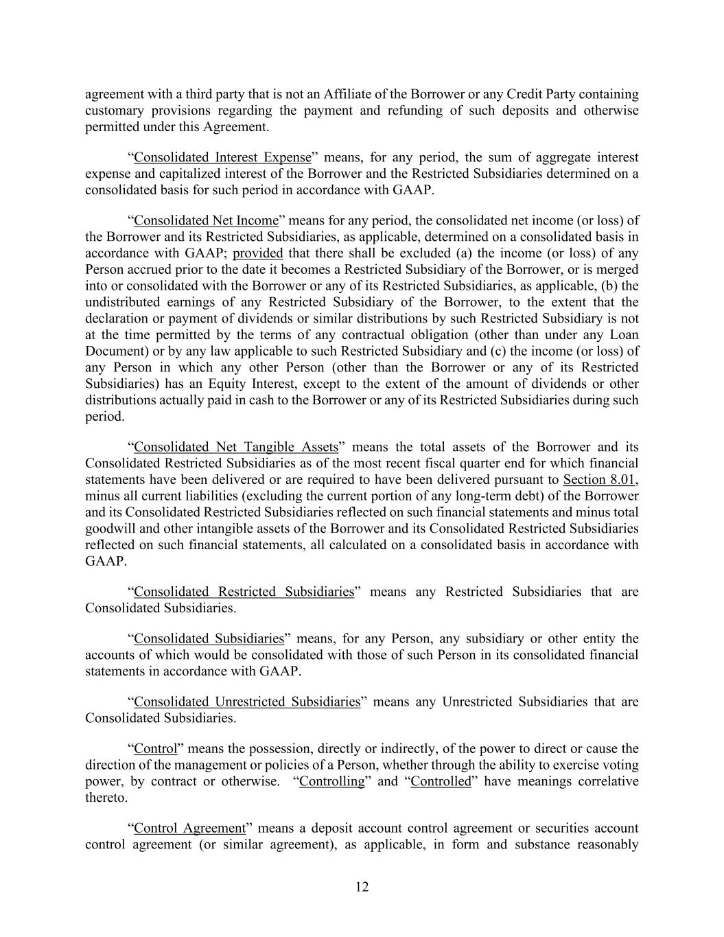 12 agreement with a third party that is not an Affiliate of the Borrower or any Credit Party containing customary provisions regarding the payment and refunding of such deposits and otherwise permitted under this Agreement. “Consolidated Interest Expense” means, for any period, the sum of aggregate interest expense and capitalized interest of the Borrower and the Restricted Subsidiaries determined on a consolidated basis for such period in accordance with GAAP. “Consolidated Net Income” means for any period, the consolidated net income (or loss) of the Borrower and its Restricted Subsidiaries, as applicable, determined on a consolidated basis in accordance with GAAP; provided that there shall be excluded (a) the income (or loss) of any Person accrued prior to the date it becomes a Restricted Subsidiary of the Borrower, or is merged into or consolidated with the Borrower or any of its Restricted Subsidiaries, as applicable, (b) the undistributed earnings of any Restricted Subsidiary of the Borrower, to the extent that the declaration or payment of dividends or similar distributions by such Restricted Subsidiary is not at the time permitted by the terms of any contractual obligation (other than under any Loan Document) or by any law applicable to such Restricted Subsidiary and (c) the income (or loss) of any Person in which any other Person (other than the Borrower or any of its Restricted Subsidiaries) has an Equity Interest, except to the extent of the amount of dividends or other distributions actually paid in cash to the Borrower or any of its Restricted Subsidiaries during such period. “Consolidated Net Tangible Assets” means the total assets of the Borrower and its Consolidated Restricted Subsidiaries as of the most recent fiscal quarter end for which financial statements have been delivered or are required to have been delivered pursuant to Section 8.01, minus all current liabilities (excluding the current portion of any long-term debt) of the Borrower and its Consolidated Restricted Subsidiaries reflected on such financial statements and minus total goodwill and other intangible assets of the Borrower and its Consolidated Restricted Subsidiaries reflected on such financial statements, all calculated on a consolidated basis in accordance with GAAP. “Consolidated Restricted Subsidiaries” means any Restricted Subsidiaries that are Consolidated Subsidiaries. “Consolidated Subsidiaries” means, for any Person, any subsidiary or other entity the accounts of which would be consolidated with those of such Person in its consolidated financial statements in accordance with GAAP. “Consolidated Unrestricted Subsidiaries” means any Unrestricted Subsidiaries that are Consolidated Subsidiaries. “Control” means the possession, directly or indirectly, of the power to direct or cause the direction of the management or policies of a Person, whether through the ability to exercise voting power, by contract or otherwise. “Controlling” and “Controlled” have meanings correlative thereto. “Control Agreement” means a deposit account control agreement or securities account control agreement (or similar agreement), as applicable, in form and substance reasonably