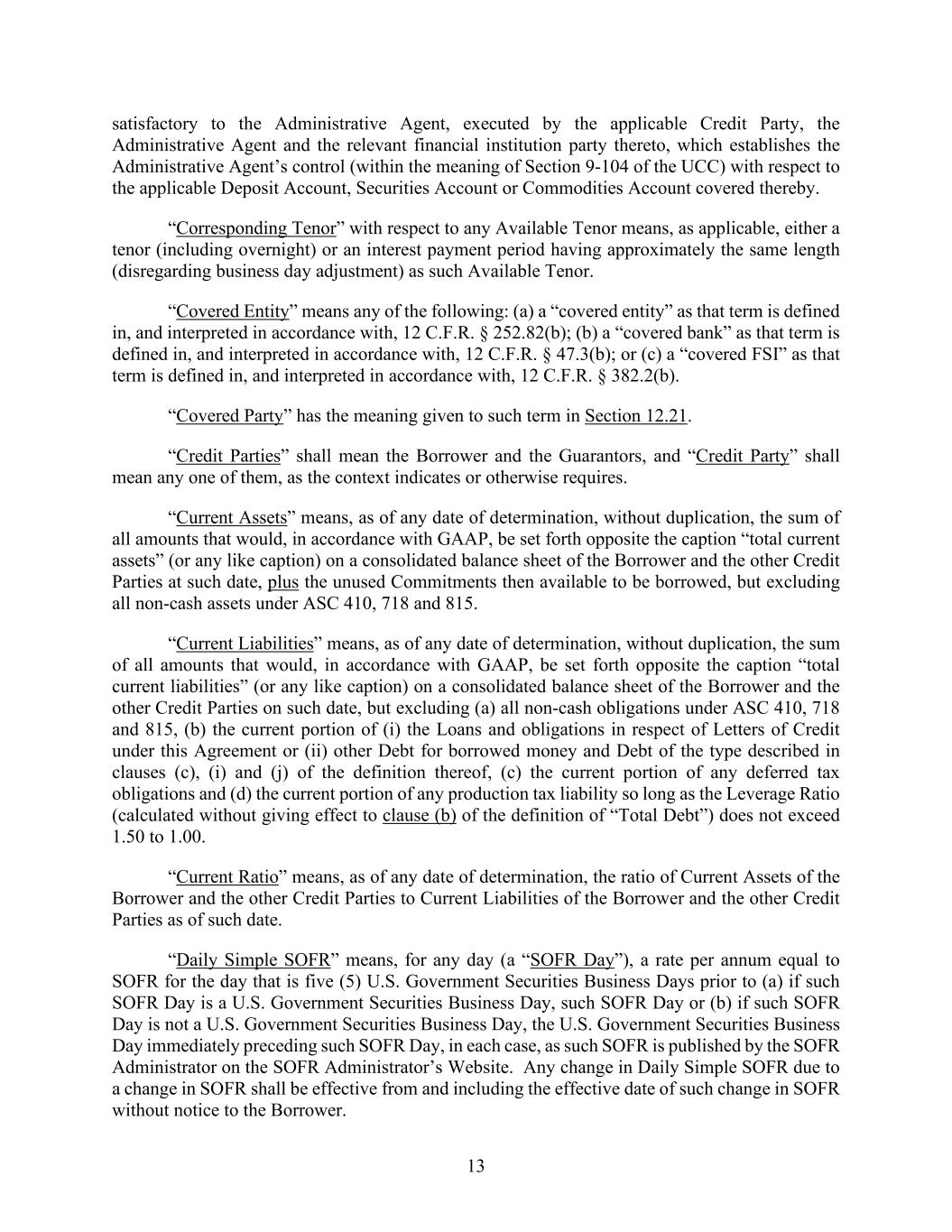 13 satisfactory to the Administrative Agent, executed by the applicable Credit Party, the Administrative Agent and the relevant financial institution party thereto, which establishes the Administrative Agent’s control (within the meaning of Section 9-104 of the UCC) with respect to the applicable Deposit Account, Securities Account or Commodities Account covered thereby. “Corresponding Tenor” with respect to any Available Tenor means, as applicable, either a tenor (including overnight) or an interest payment period having approximately the same length (disregarding business day adjustment) as such Available Tenor. “Covered Entity” means any of the following: (a) a “covered entity” as that term is defined in, and interpreted in accordance with, 12 C.F.R. § 252.82(b); (b) a “covered bank” as that term is defined in, and interpreted in accordance with, 12 C.F.R. § 47.3(b); or (c) a “covered FSI” as that term is defined in, and interpreted in accordance with, 12 C.F.R. § 382.2(b). “Covered Party” has the meaning given to such term in Section 12.21. “Credit Parties” shall mean the Borrower and the Guarantors, and “Credit Party” shall mean any one of them, as the context indicates or otherwise requires. “Current Assets” means, as of any date of determination, without duplication, the sum of all amounts that would, in accordance with GAAP, be set forth opposite the caption “total current assets” (or any like caption) on a consolidated balance sheet of the Borrower and the other Credit Parties at such date, plus the unused Commitments then available to be borrowed, but excluding all non-cash assets under ASC 410, 718 and 815. “Current Liabilities” means, as of any date of determination, without duplication, the sum of all amounts that would, in accordance with GAAP, be set forth opposite the caption “total current liabilities” (or any like caption) on a consolidated balance sheet of the Borrower and the other Credit Parties on such date, but excluding (a) all non-cash obligations under ASC 410, 718 and 815, (b) the current portion of (i) the Loans and obligations in respect of Letters of Credit under this Agreement or (ii) other Debt for borrowed money and Debt of the type described in clauses (c), (i) and (j) of the definition thereof, (c) the current portion of any deferred tax obligations and (d) the current portion of any production tax liability so long as the Leverage Ratio (calculated without giving effect to clause (b) of the definition of “Total Debt”) does not exceed 1.50 to 1.00. “Current Ratio” means, as of any date of determination, the ratio of Current Assets of the Borrower and the other Credit Parties to Current Liabilities of the Borrower and the other Credit Parties as of such date. “Daily Simple SOFR” means, for any day (a “SOFR Day”), a rate per annum equal to SOFR for the day that is five (5) U.S. Government Securities Business Days prior to (a) if such SOFR Day is a U.S. Government Securities Business Day, such SOFR Day or (b) if such SOFR Day is not a U.S. Government Securities Business Day, the U.S. Government Securities Business Day immediately preceding such SOFR Day, in each case, as such SOFR is published by the SOFR Administrator on the SOFR Administrator’s Website. Any change in Daily Simple SOFR due to a change in SOFR shall be effective from and including the effective date of such change in SOFR without notice to the Borrower.